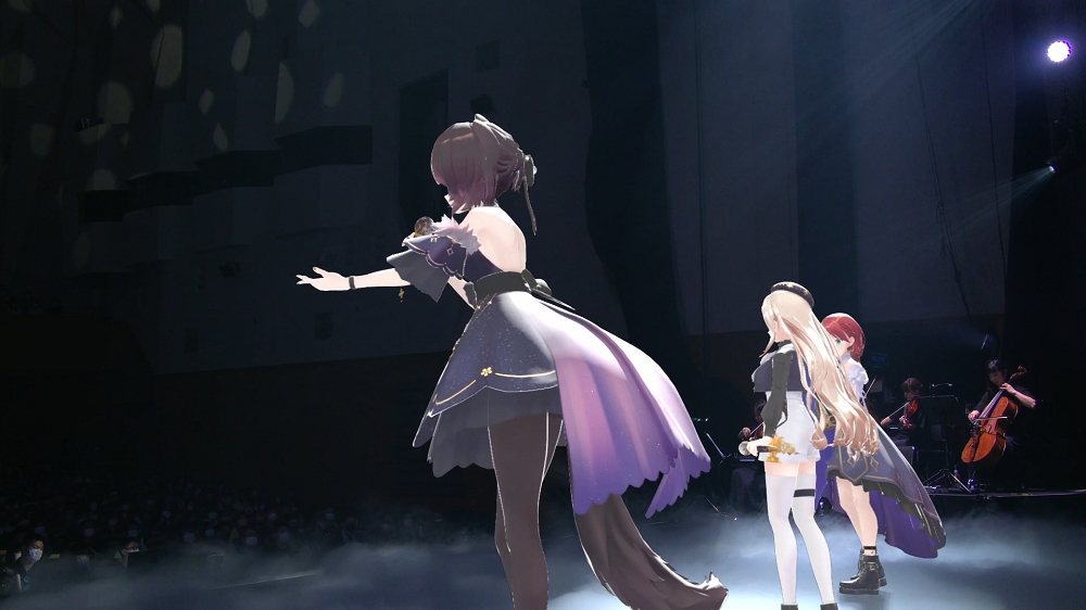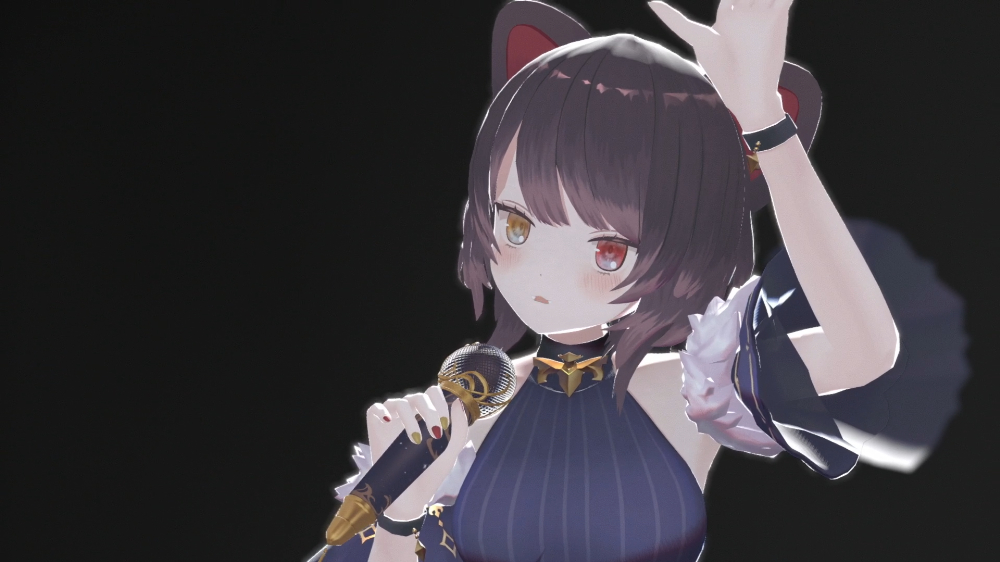 またここからはソロ曲のパートが続いた。先鋒を務めた朝日南アカネの『Unchained』はユニットの曲とはガラリと雰囲気を変えて、K-POPのようなアグレッシブなダンスチューンを歌い上げる。続く町田ちまの『名前のない感情』はまさに曲名の通りに、なんと表現するのが正しいのか言葉を選ぶのが難しいが、あたたかく温もりを感じるのに、その奥に芯の強さと覚悟を感じさせる、優しさと強さを兼ね備えた歌声をボクらに届けてくれた。総大将の戌亥とこが最後に歌い上げる『六道伍感さんぽ』はとにかくアーバンで、たゆたうメロディに身を預けると、自然と身体が動き出してしまう。朝日南の強めな入りから、町田のワンクッションを挟み、戌亥でふんわりと着地させる曲順の良さに思わず腕を組み、深く頷くしかなかった。