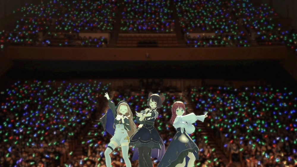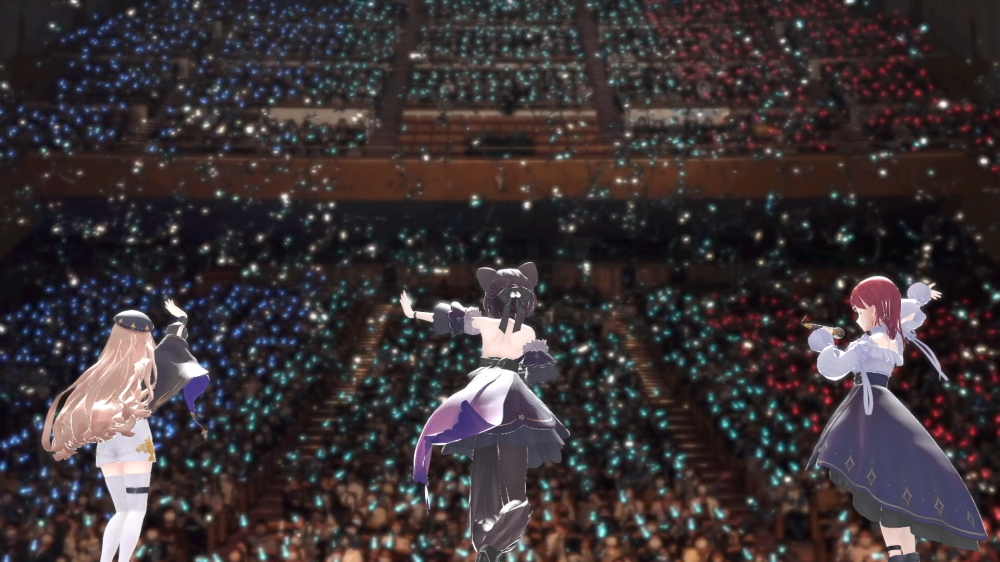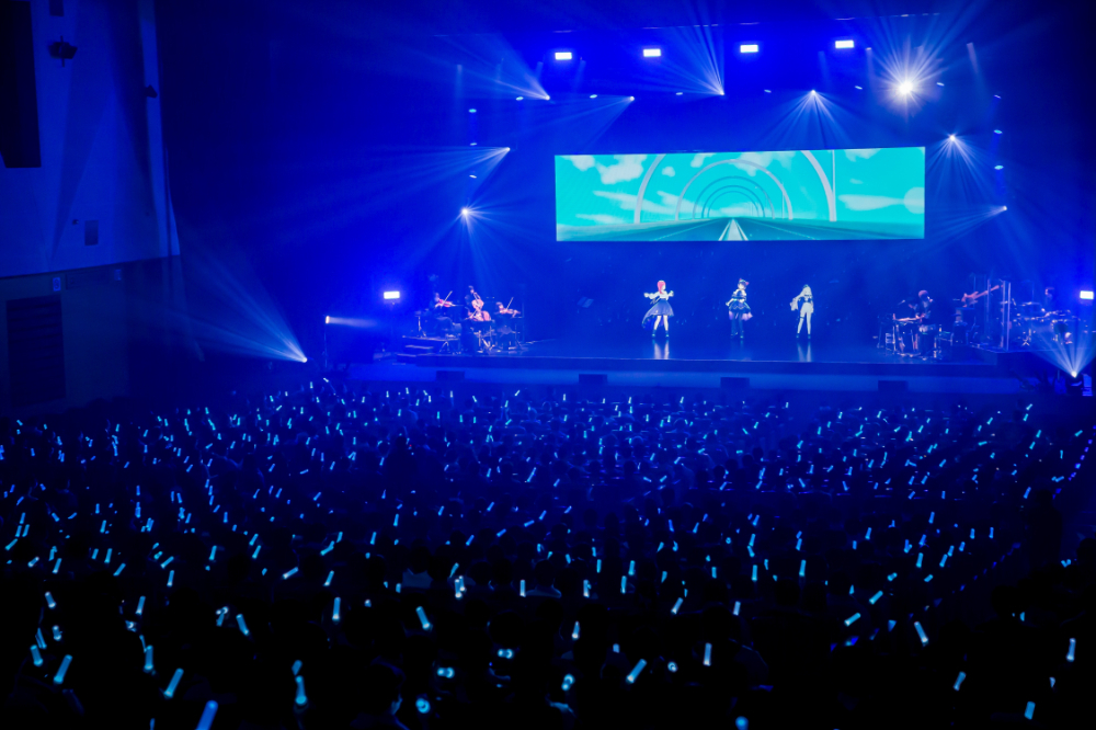 ここまで3曲続けたところで、彼女たちから自己紹介と挨拶が入る。今回にじさんじのライブでは初導入となる『FreFlow(フリフラ)』と呼ばれる無線制御式のペンライトの話題にもなり、「みんな振ってみて〜」という戌亥の呼びかけに応じると、場内は一気に青と白のグラデーションに染まる。また改めて声出しOKのアナウンスもあり「皆さん、盛り上がっていけますか?」に対するレスポンスの熱気に驚きつつも、すぐに「愛嬌〜!!!」と叫ばせたりと、3人だけではなく観客も含め、少しずつライブの勘を取り戻していく。