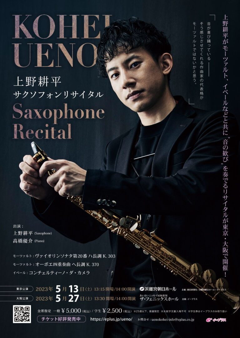 サックス界のスタープレイヤー上野耕平が2023年4月22日(土)、5月13日(土)、5月27日(土)にそれぞれ名古屋、東京、大阪で単独リサイタルを開催する。東京でのソロ演奏会開催は12年の9月以来、実に約一年半ぶり。上野自身も「楽しみで仕方ない」という。モーツァルト作品二題を冒頭に据えるという前代未聞のプログラミングもまた注目の的だ。上野らしい挑戦だが、その意図を、そして今後のソロ活動における展望を聞いた。
