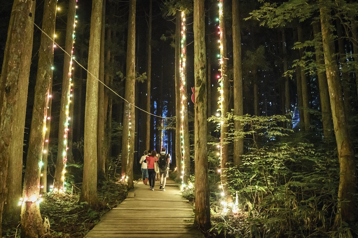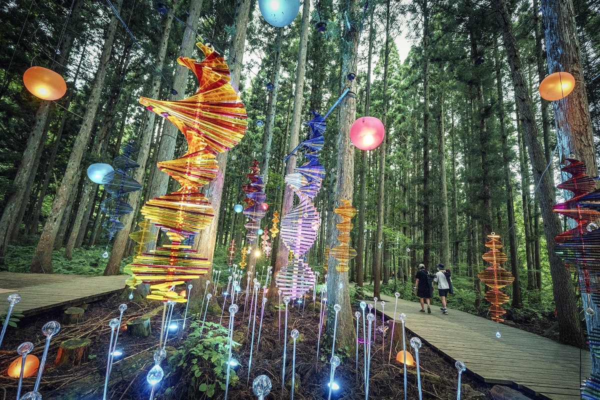 さらに『フジロック』開催期間中は昼と夜でその景色がガラッと変わるのも魅力のひとつで、昼は森の中でマイナスイオンを浴びながら、川のせせらぎと近くのステージから漏れ聞こえてくる音楽を感じることができ、夜になると真っ暗な森の中でイルミネーションが瞬き、オブジェやミラーボールを美しく照らす幻想的な空間に様変わりする。