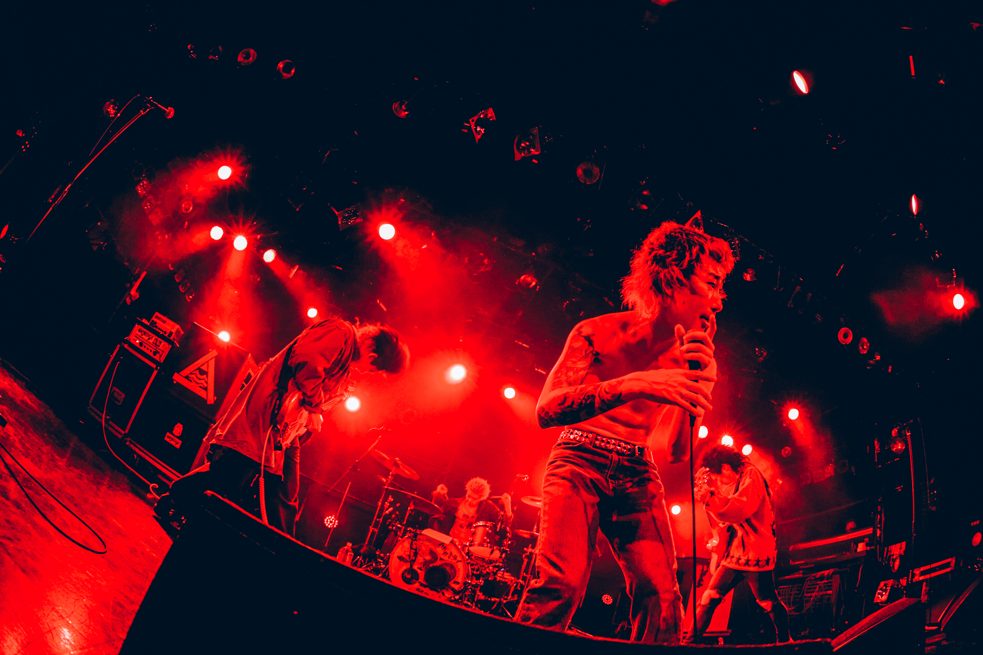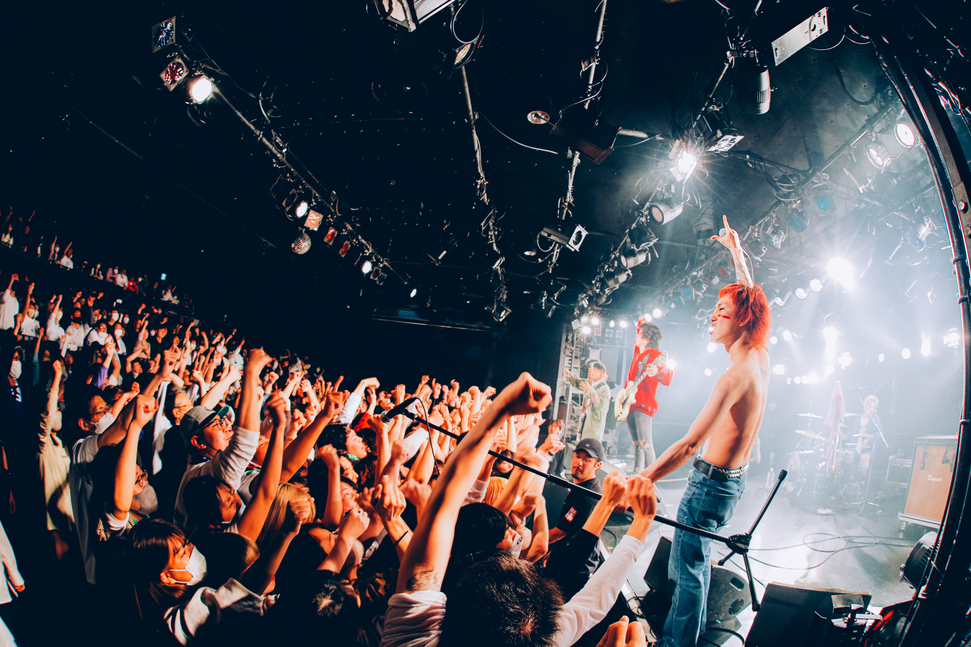 これまた端的に橋本が言葉で表現する。激しく楽しみ過ぎてスマホを落とした人がいれば、拾って持ち主を探して、観客に託して持ち主へと返す。持ち主にはスマホを渡してくれた観客への御礼も促す。それこそ橋本はいい奴であるし、ライブ前半を観ているだけでも伝わってきたが、当たり前の話ではあるものの、彼らは勿論シンプルに荒々しいだけではない。既に先述したが、喋りを挟んだり、カウントのみであったり、瞬時の曲繋がりは繊細緻密であるし、それを繊細緻密に一切感じさせないワイルドさが驚異的である。そして、「predawn」などメロディックなのも惹きつけられる要因であろう。「世界を終わらせて」など観客が一緒に歌えるという、つまりはシンガロング出来るのも、観客にとっては堪らないはずだ。橋本は初見の観客に対して、「USJのアトラクションだと思って楽しんで!」と言っていたが、この体感的ライブを、それもコロナ禍で通常通りライブが楽しめなかった長い期間を経た今楽しめるのは、待ち侘びた観客にとっては至福の時間である。