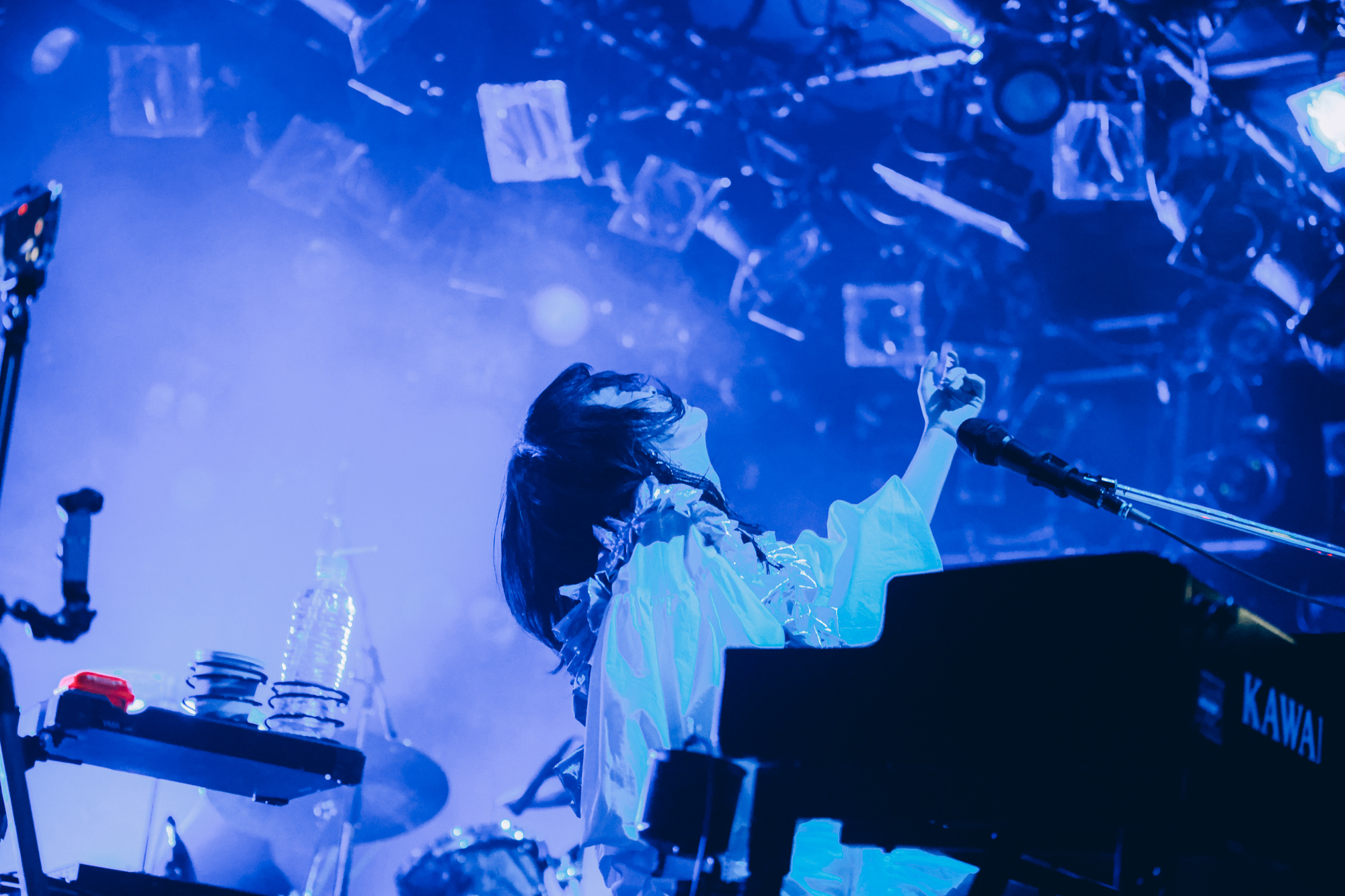 先行はヒグチアイ。無音の暗転の中で現れて、鍵盤の前に座ったヒグチは、ゆっくり左右の腕を絡ませて曲げて伸ばしている。首も静かに回して、まさしく戦闘態勢。静かな闘志を感じる。山本晃紀(Dr)、御供信弘(Ba)、ひぐちけい(Gt)というバンド編成であり、後方の山本を確認して、ドラムカウントから「やめるなら今」が厳かに始まる。