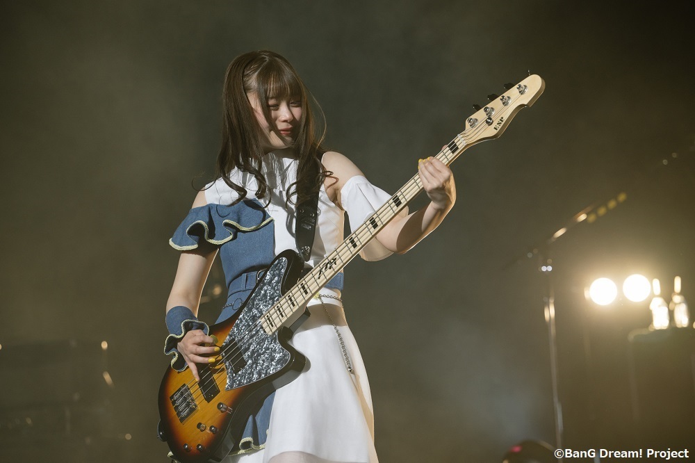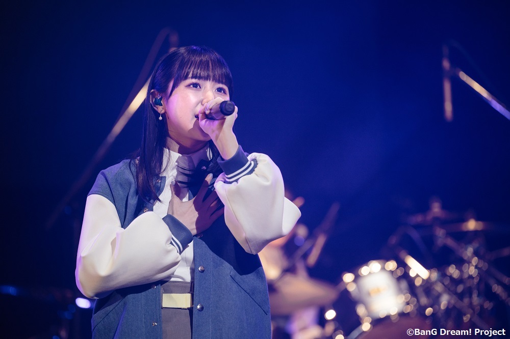歓声がさらに大きくなるなか、ステージの前にあった紗幕が落ち、さっそく「壱雫空」が披露された。白と青のツートーンに薄い黄色のラインが入った衣装をまとった5人の姿がはっきりと現れ、ステージ後ろの液晶モニタには大きく「MyGO!!!!!」のロゴが映し出される。キャッチコピーにある「現実“リアル”と仮想“キャラクター”が同期」したような瞬間と、メロコア的な勢いのある楽曲の力強さもしっかりハマり、祝祭感のある時間が繰り広げられた。