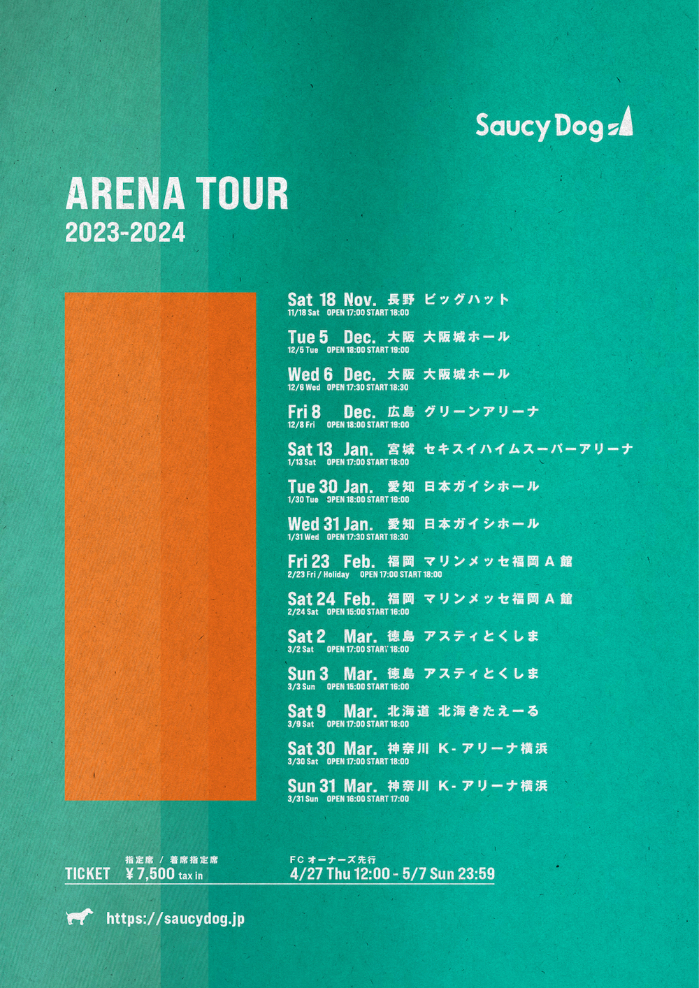 アリーナツアーは、2023年11月の長野公演を皮切りに2024年3月の横浜公演まで全国9箇所14公演、総キャパシティが約13万人に及ぶSaucy Dogキャリア最大規模のアリーナツアーとなる。