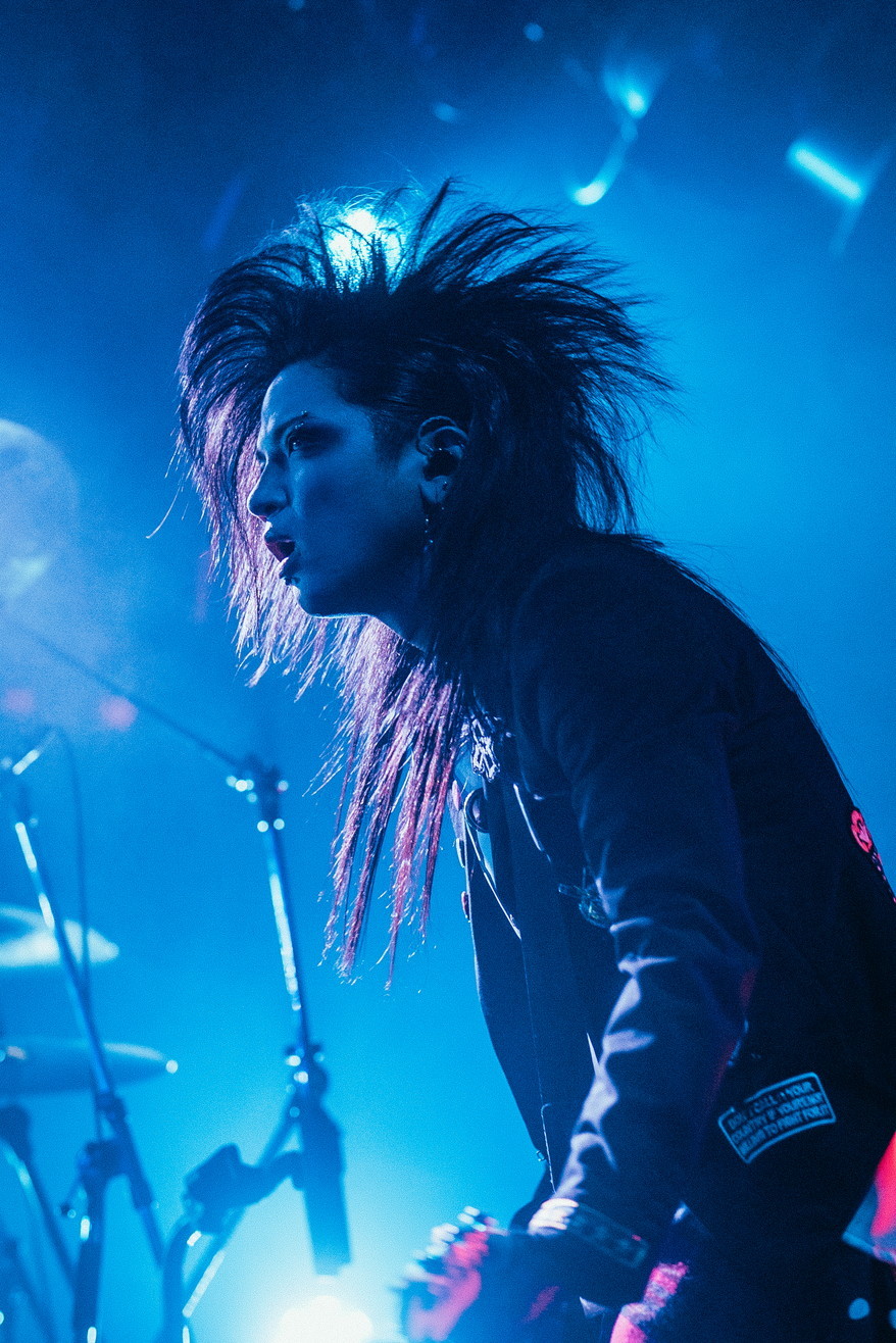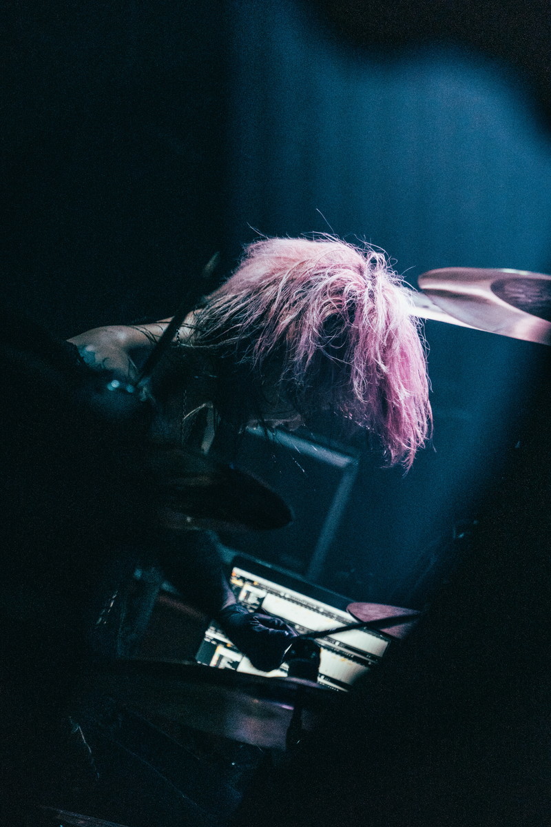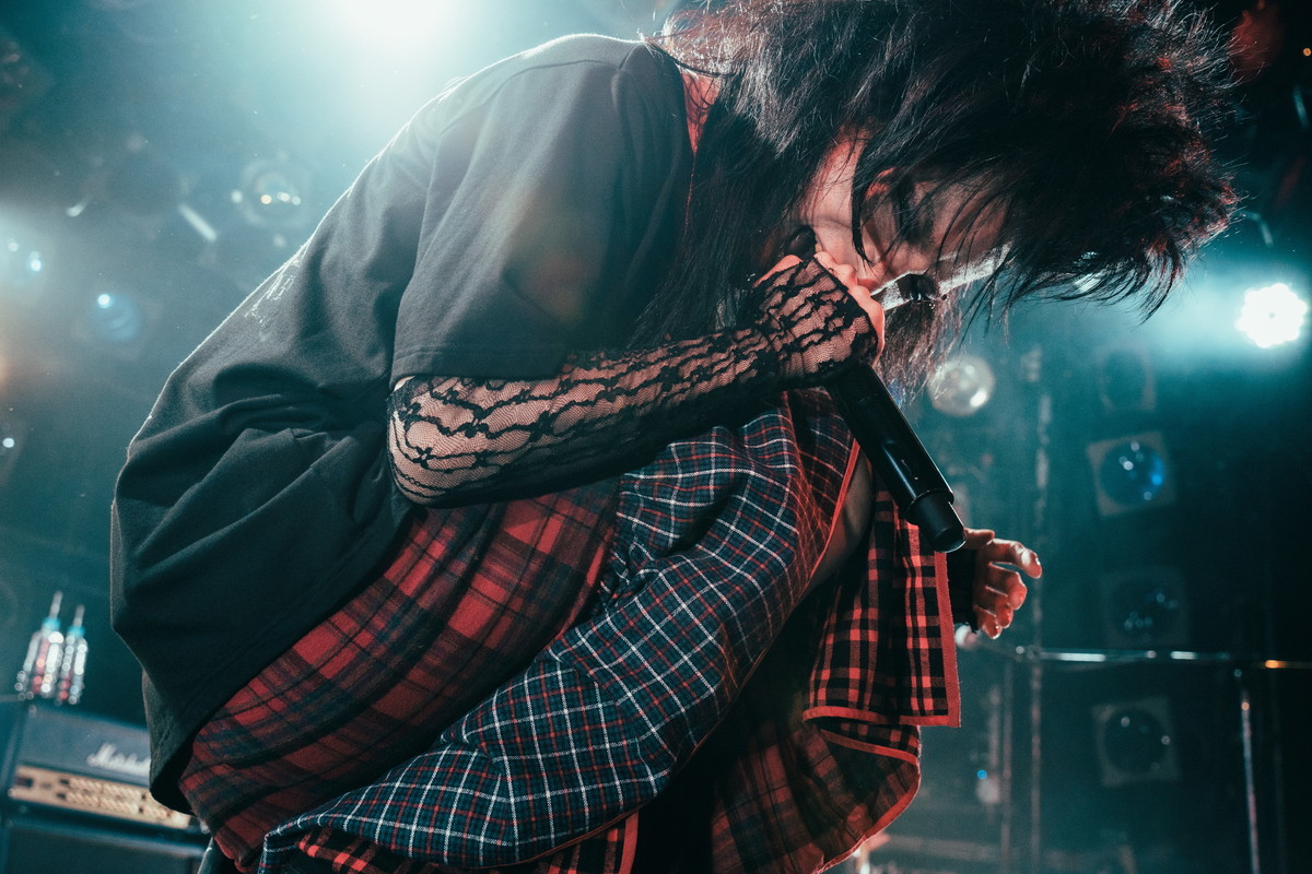 《生まれてしまったことがもう間違いだ》というフレーズから始まる「Dark In Black Hole」でライブは幕を開けた。生きる苦しみと絶望を音に込めて発散するように、滑り出しから爆音を轟かせる。そんな彼らに共鳴するよう、観客たちもイントロから思い切り頭を振っていた。不協和音が響く中、ステージを照らすライトが真っ赤に変わると「「誤解」」が始まり、会場の空気が張り詰める。ダウナーかつ緊張感のある独特の雰囲気は、DEZERTのライブならではだ。