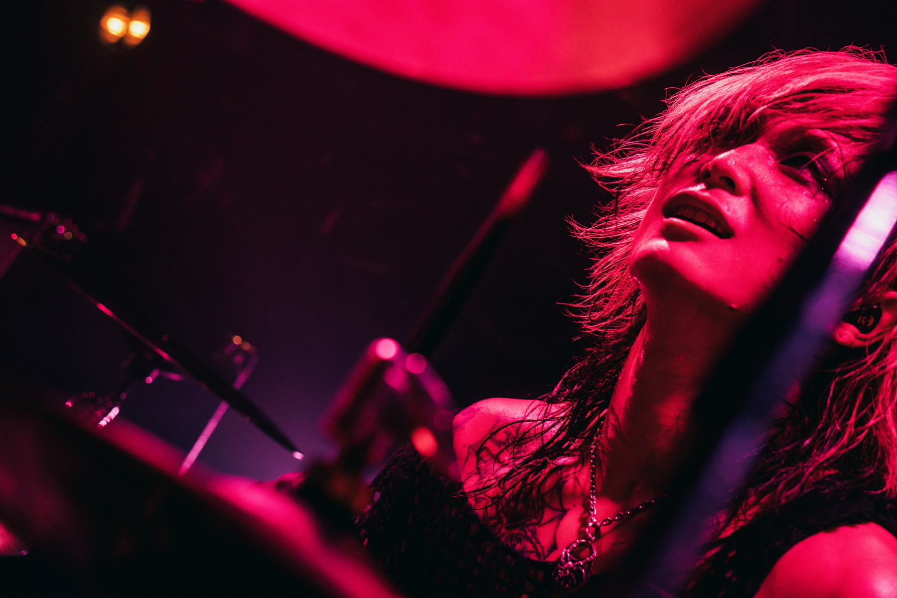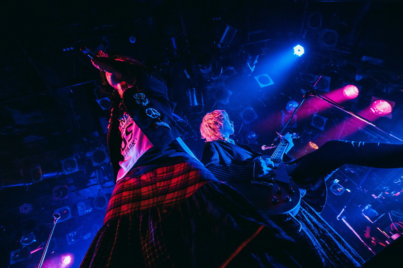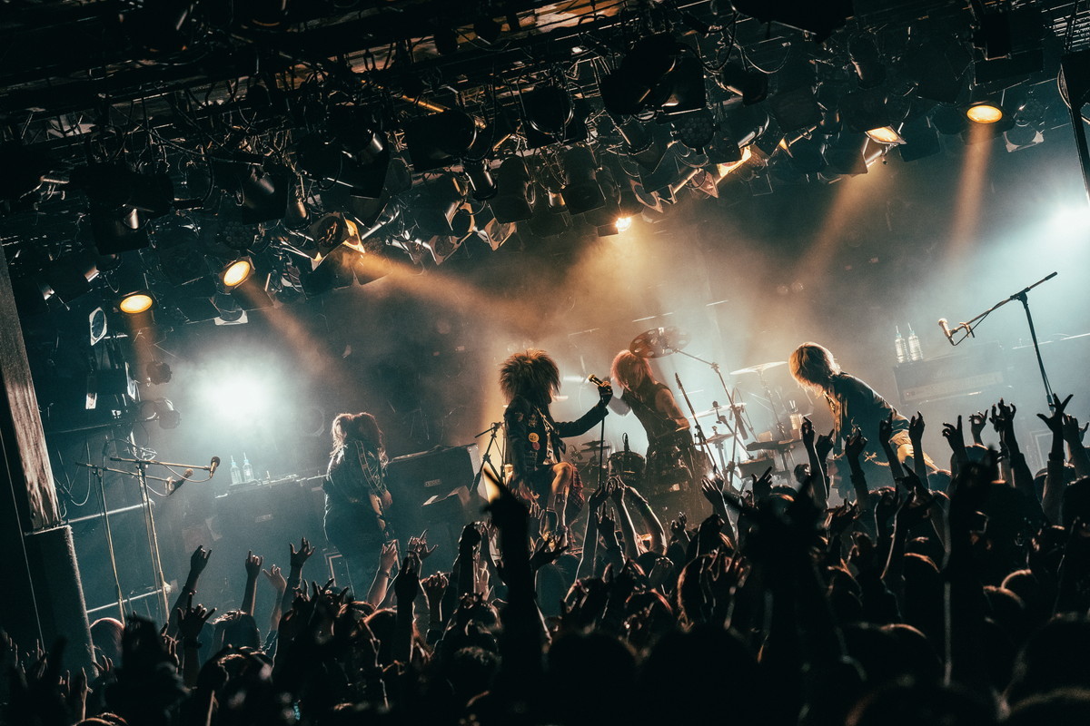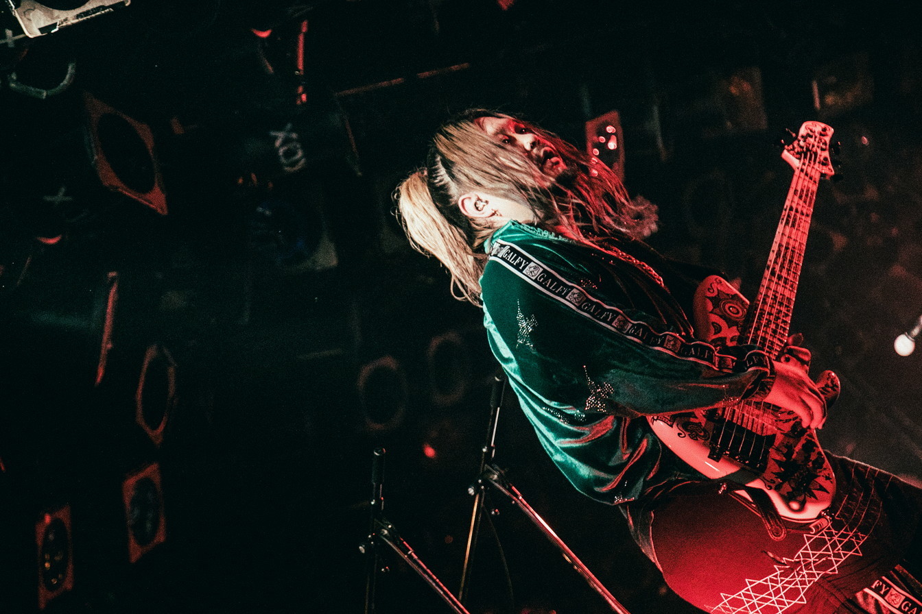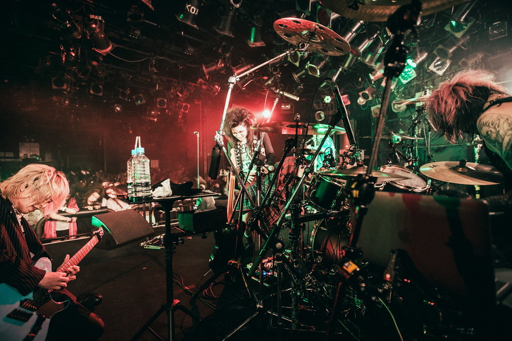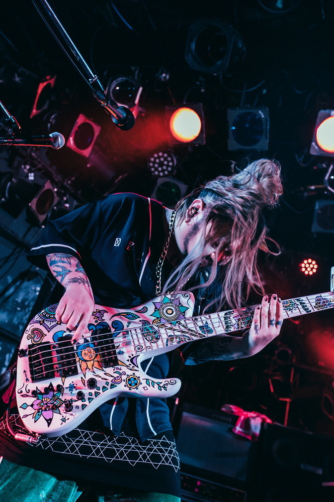 続く「バケモノ」は、対照的に疾走感のあるキャッチーな曲。先ほどまでの重たい空気がガラリと変わり、観客たちは「オイ! オイ!」と声を上げながら拳を突き上げる。千秋(Vo)は、Miyako(Gt)、Sacchan(Ba)の元へ順番に近づき、メンバーをも煽るような仕草を見せた。すると、「Thirsty?」では、2人がお立ち台に乗ってフロアを扇動。後方でSORA(Dr)も全身の力を叩きつけるような激しいドラムプレイを見せ、ステージとフロアが一緒に熱を高め合っていく。