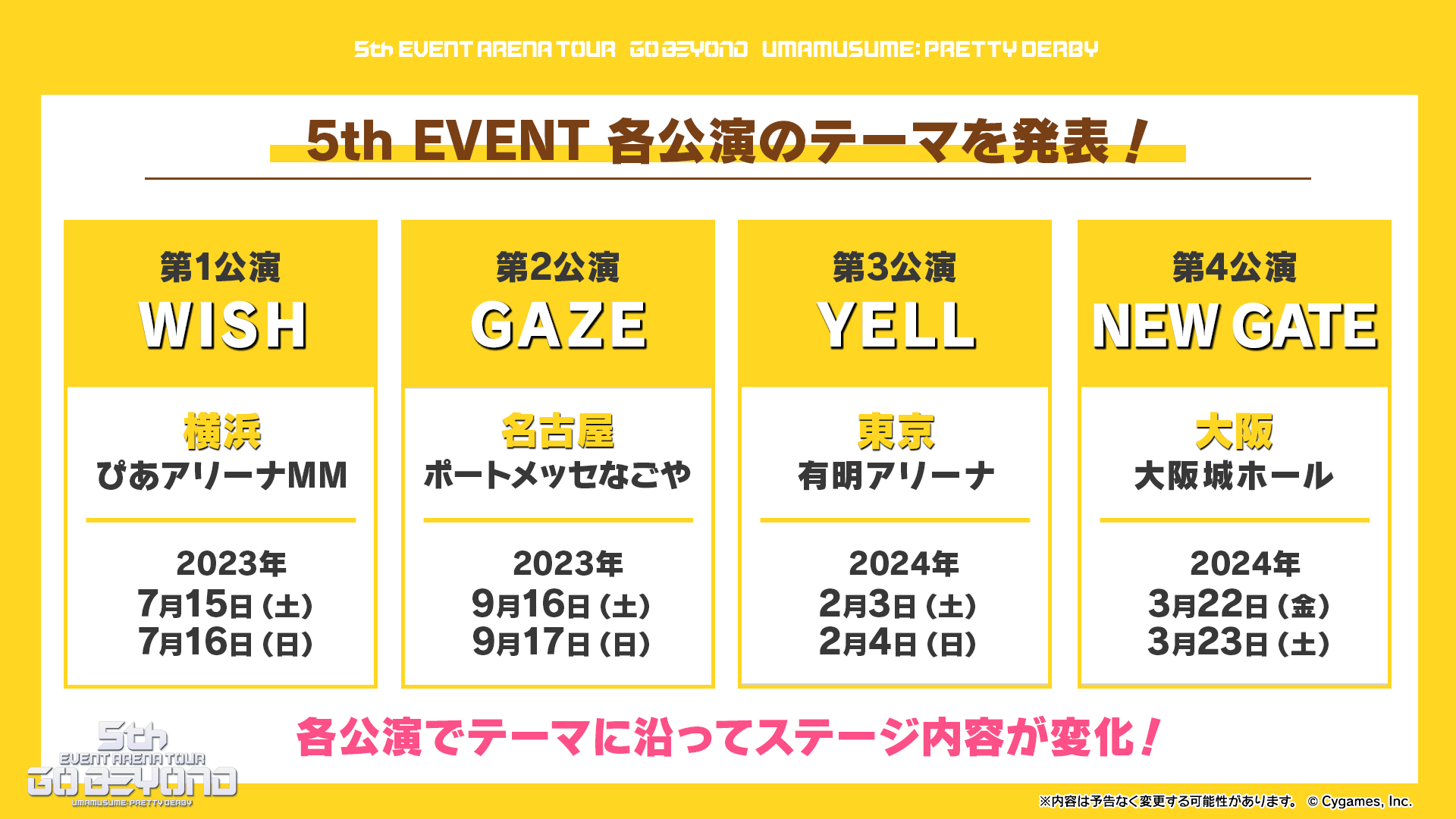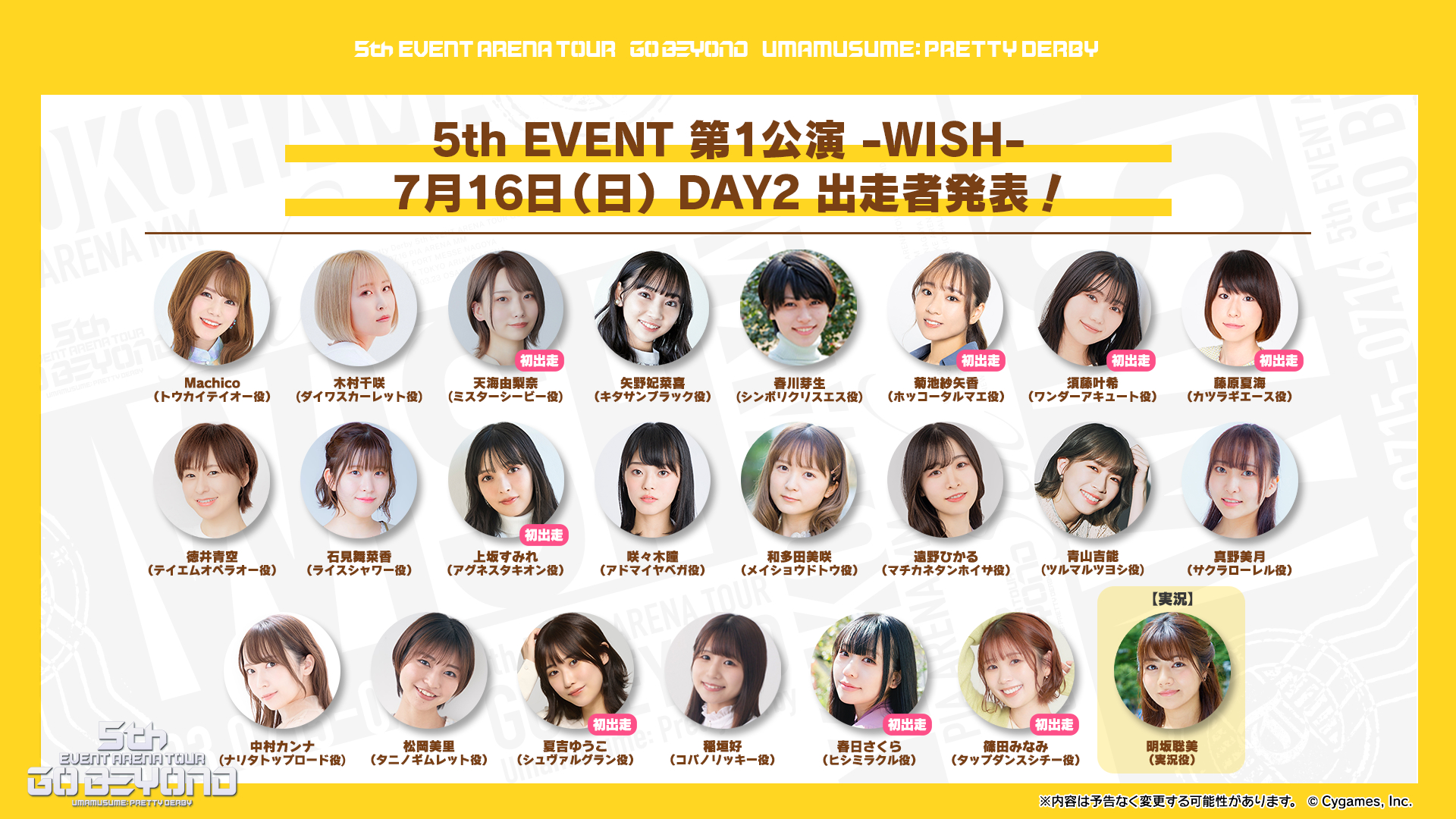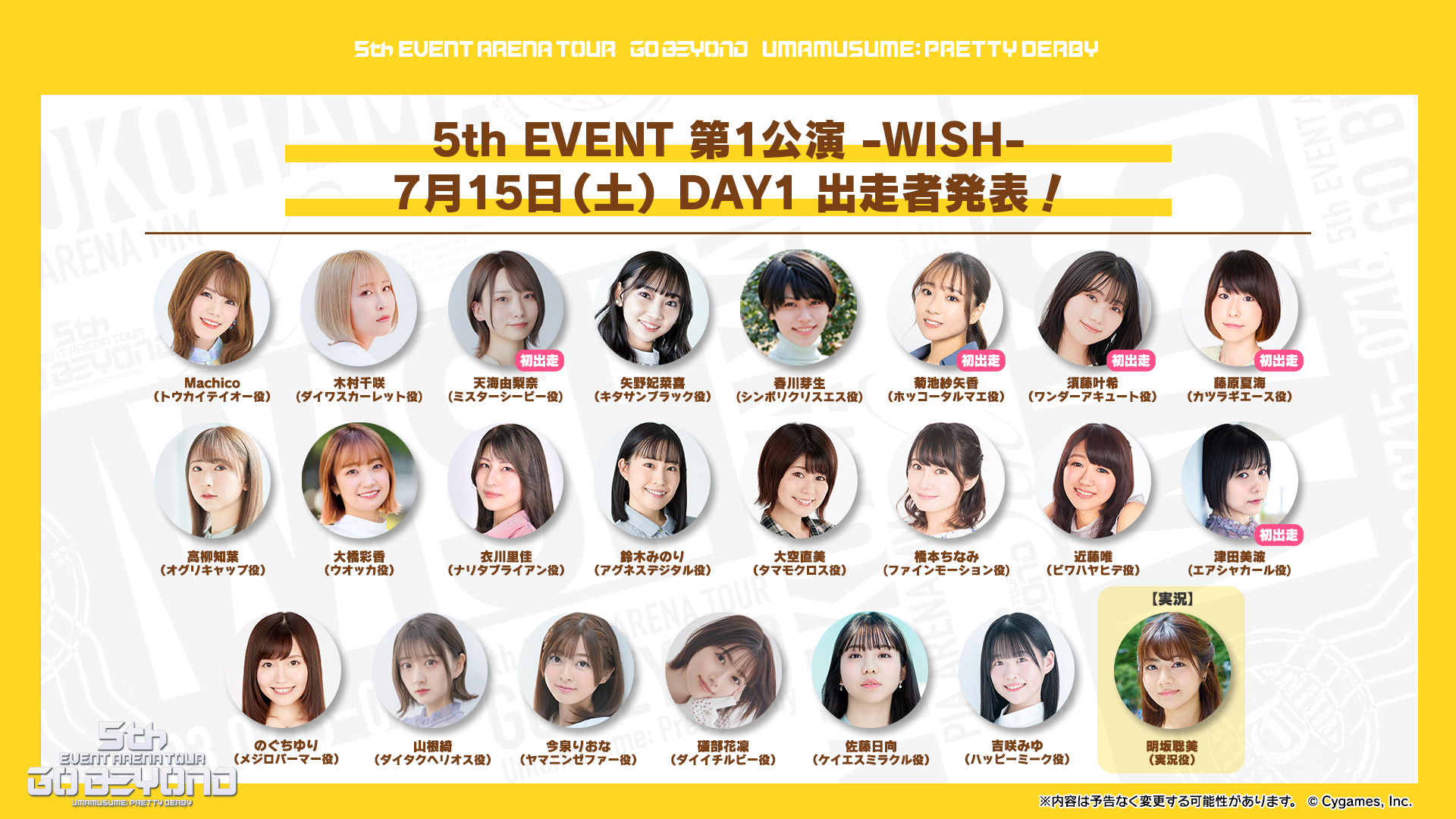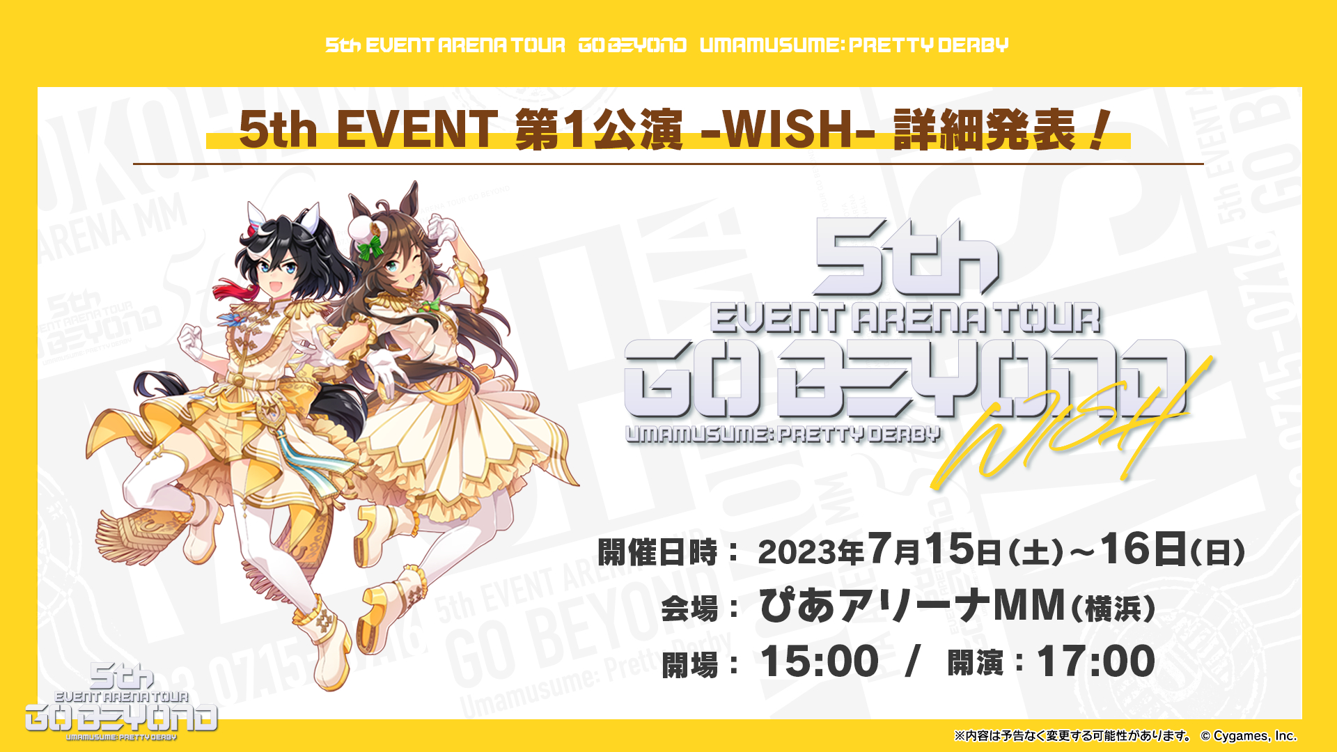 2023年7月15日(土)、16日(日)に横浜のぴあアリーナMMで開催される第1公演『ウマ娘 プリティーダービー 5th EVENT ARENA TOUR GO BEYOND -WISH-』の出走者も発表されている。