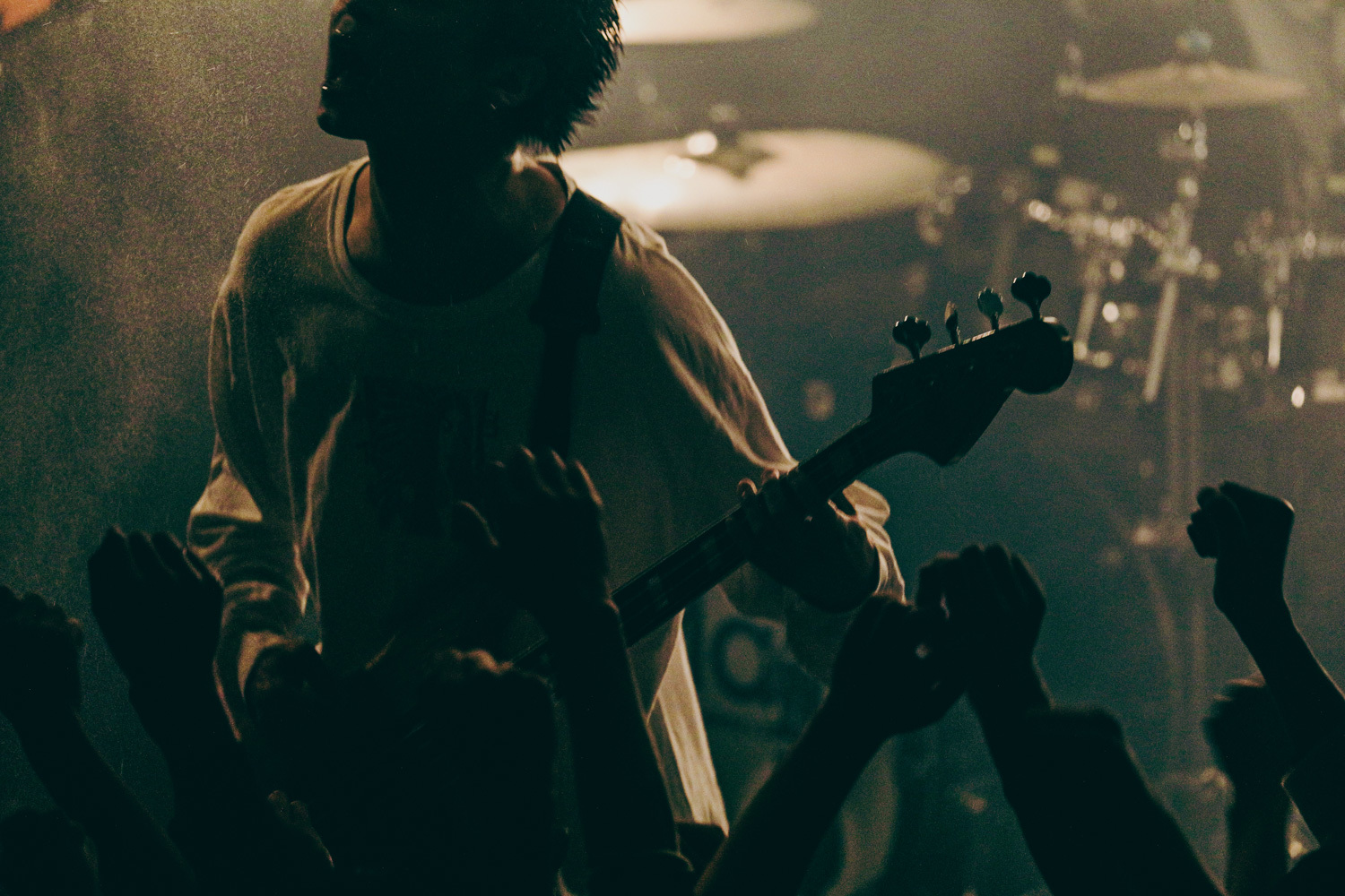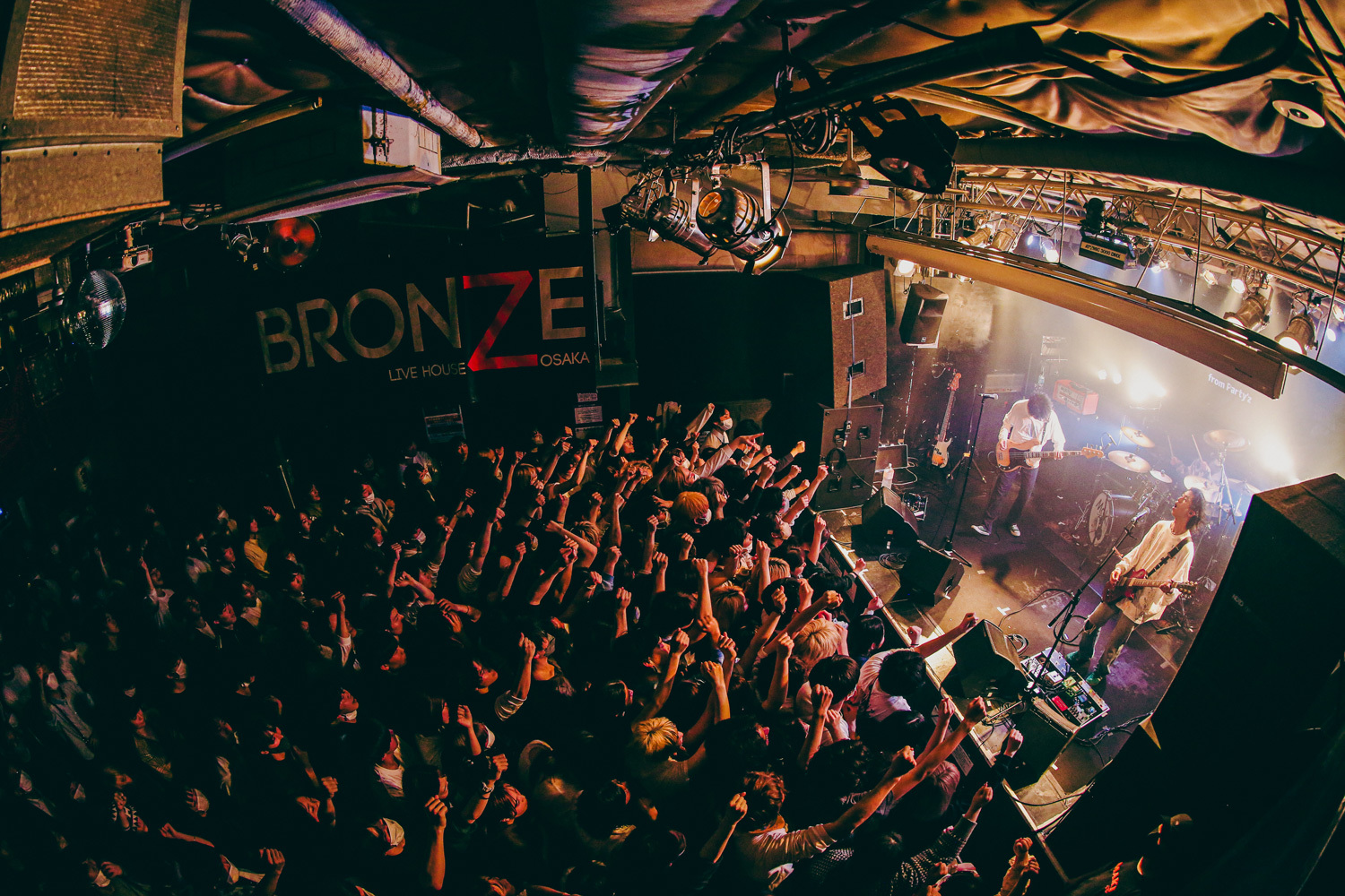 アンコールでは山本が「熱いね、BRONZE。すごいね。Gパンぐっちゃぐちゃ」と笑い、<どうかまたー!>と歌い始める。「平凡の愛し方」だと察したフロアは拳を突き上げ、波のようにうごめく。「一瞬を楽しむ」。その約束を守るように全力で暴れまわる観客を愛おしそうに見つめるまっち。佳大は髪を振り乱してギターソロをバッチリキメる。願いが込められたハーモニーが全身を駆け巡る。山本は「何があってももう大丈夫だな。ずっと、ずっとライブハウスで歌おうな」と力強く語り、最後の1曲を「こころ」で締め括った。「マジで、マジで愛してるわ」の言葉と爆音を合図に、フロアは一瞬にしてもみくちゃ状態に。何と、サバシスターのなちもダイブ! そして高まった佳大もステージから後ろ向きにダイブ! 沸点をとっくに超えていた会場が臨界点を突破した。