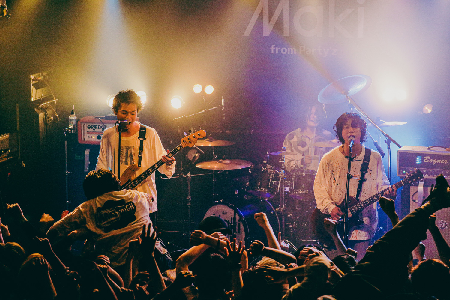 「RINNE」のイントロが聞こえた瞬間、悲鳴に近い歓声が湧き起こり、思わず鳥肌が立った。山本響(Vo.Ba)の優しい弾き語りが響き、暗闇の中で続々と拳が天に突き上げられる。「from Party’z Maki、始めます」の言葉を合図に、まっち(Dr)の爆裂ドラムが叩き込まれるとフロアが大きく揺らめき、早速ダイバーが続出! そんな様子を見て嬉しそうに笑顔を見せた山本は「遊び方は自由! だけど最初に歌ったようにさ、誰かを傷つけて笑うのはやめようぜ。助け合って楽しもうぜ!」と叫び、「フタリ」を投下。佳大(Gt)のギタープレイが炸裂し、どんどんステージの方に引き込まれる。山本の歌声を引き立てる2人のコーラスも見事だ。