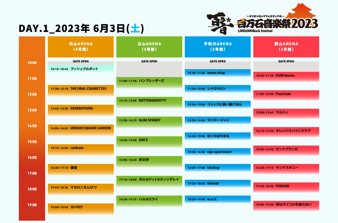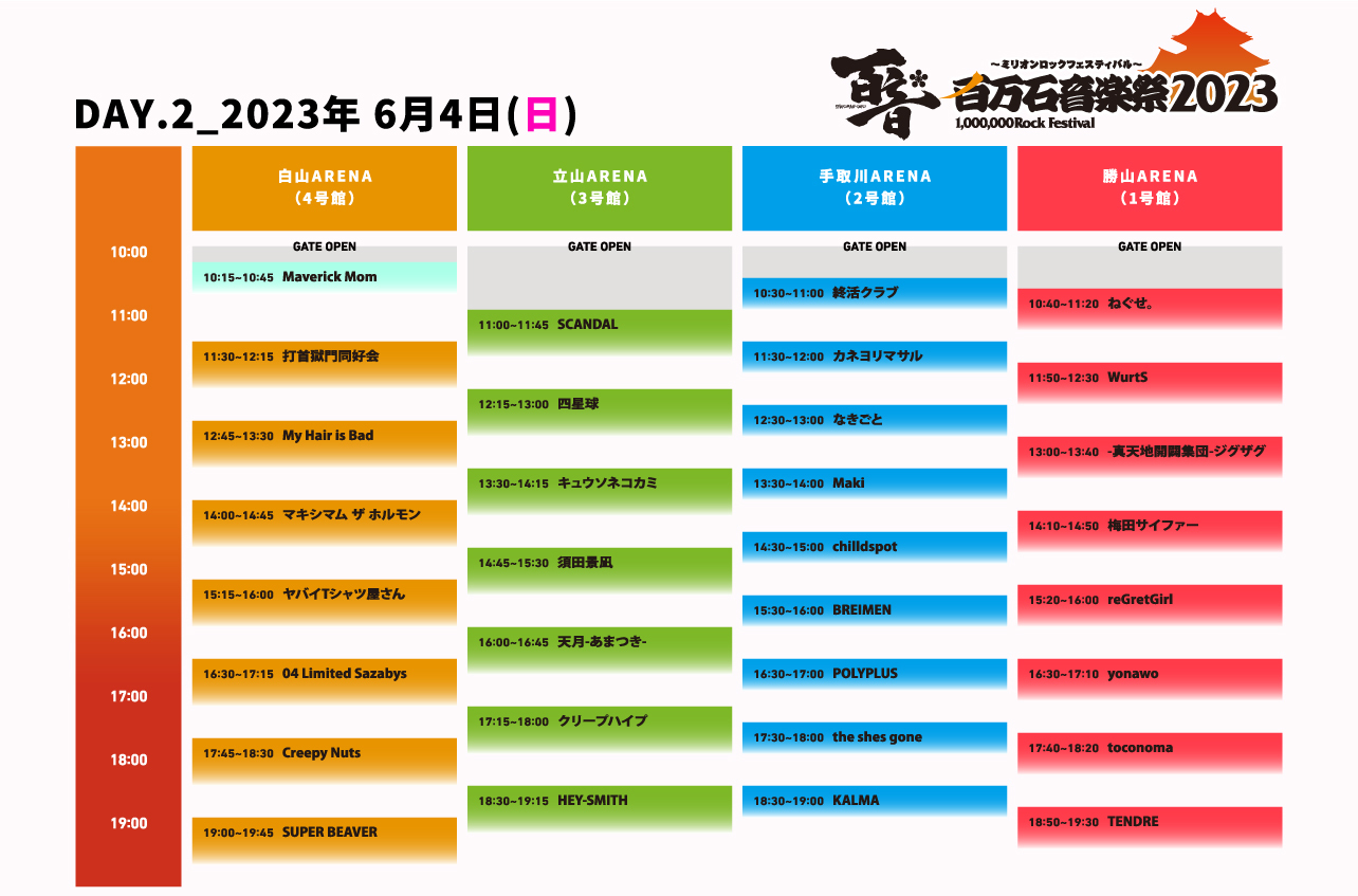 6月3日(土)、4日(日)に石川県産業展示館1~4号館で開催される『百万石音楽祭2023~ミリオンロックフェスティバル~』のタイムテーブルが発表された。