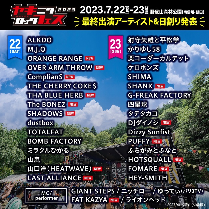 2023年7月22日~23日の2日間、長野県飯田市野底山森林公園特設ステージで開催される音楽フェス『焼來肉ロックフェス2023』通称「ヤキフェス」の全アーティスト&日割りの発表がされた。