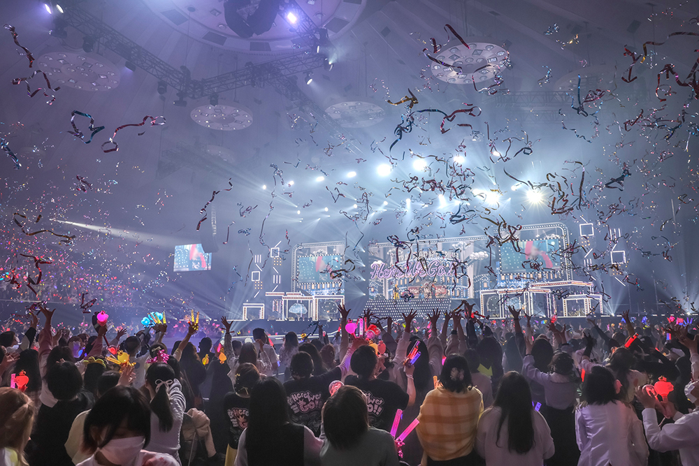 まずもって、ドット絵で描かれた4人が大冒険を繰り広げるロールプレイングゲーム風のオープニングムービーからしてドキドキワクワクが止まらない。そこに、ナポレオンジャケットをアレンジした衣装をまとった凜々しいメンバーが、メインステージ下からリフターで登場。2022年末開催のクリスマスバーチャルライブ『Strawberry Party!! Vol.2 ~Christmas Live 2022~』の世界観を引き継ぐようなステージセットに、やっぱりとてもよく似合う4人だ。