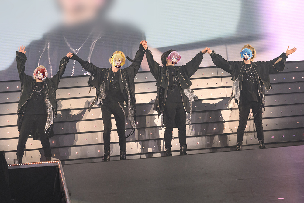 かと思えば、MCでは相変わらず仲良くジャレ合う4人。「せーの」ですとぷりすなーと一緒にタイトルコールした「チョコレートはんぶんこ」に続き、莉犬×るぅとの「がぶ・がぶ・らぶ!」では、るぅとに抱きつく莉犬、2人で作るハートマーク、るぅとが莉犬をお姫様抱っこと、かわいいが極まったり。さとみ×ころんの「天使に口付け」では、2人並んでマイクスタンドにもたれながらオトナっぽい歌声をかけ合ったり。最新アルバム『Here We Go!!』に収録のコラボ曲もまた、ライブ映えしすぎる。