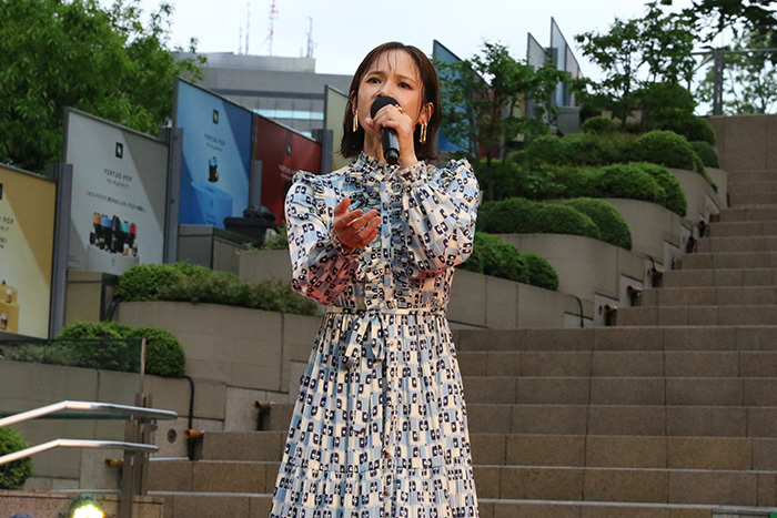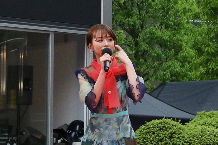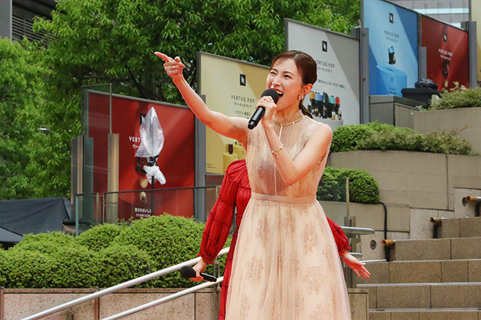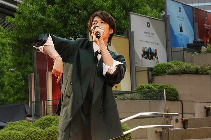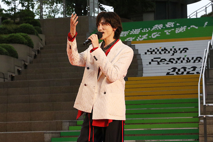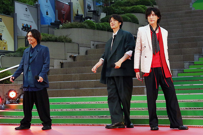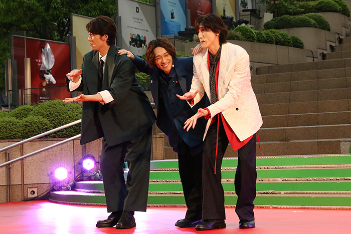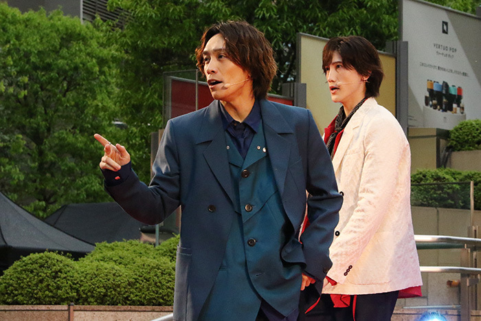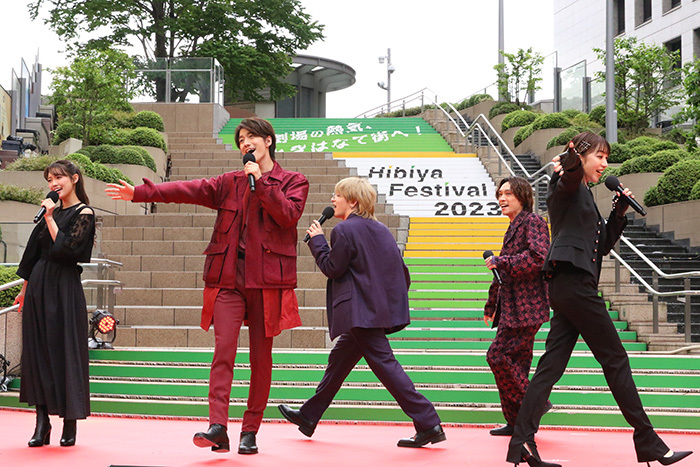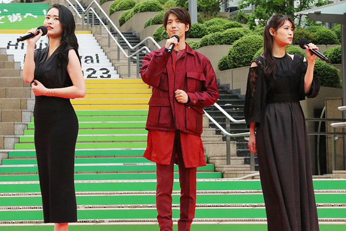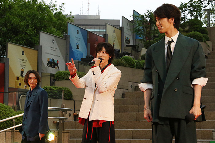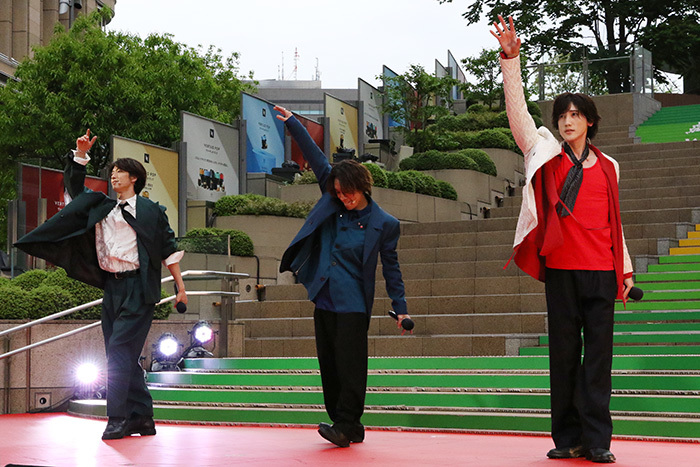 3人は付近の施設からイベントを見ている人にも手を振りながら盛り上げ、4月7日(金)に発売したフォトブックや、冬に3人で上演するコメディミュージカル『ミア・ファミリア』の話をゆるい雰囲気で繰り広げる。それぞれが俳優として活躍しており、日比谷周辺にある劇場との関わりも深いことから、各劇場や付近のパン屋に関する話題も。自然体のトークに観客席からは笑い声や歓声が幾度も上がる。