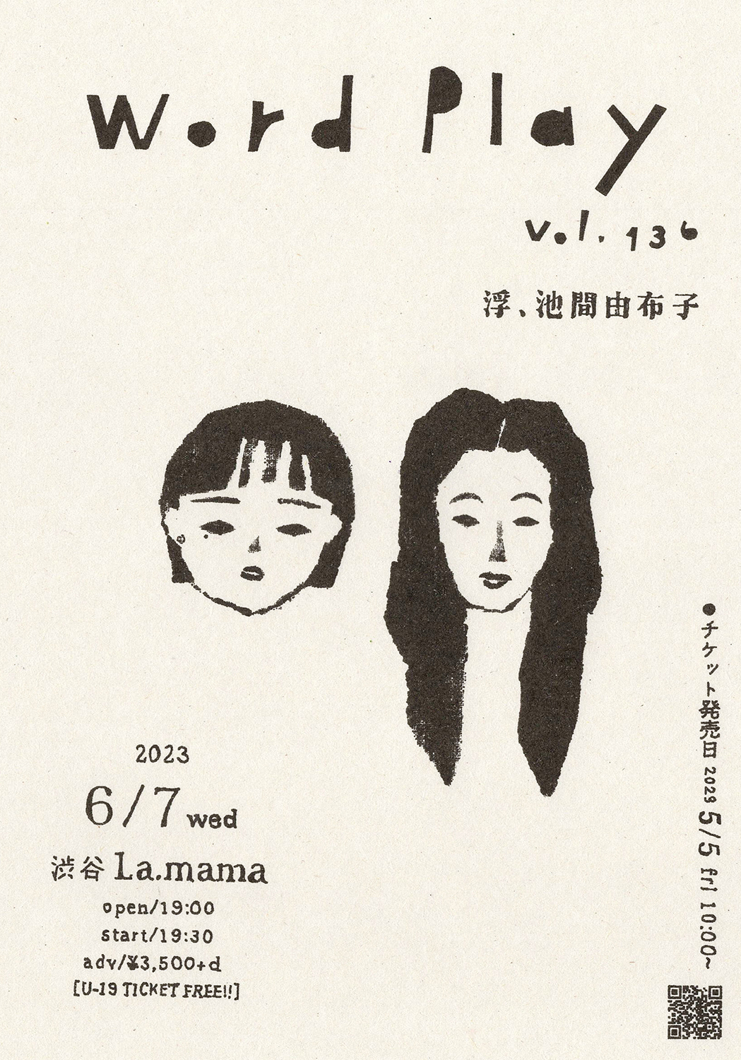 6月7日(水)に渋谷La.mamaにて、池間由布子と浮の弾き語り2マンライブが行われることが発表された。フライヤーは美術作家・イラストレーターの椎木彩子がデザインしている。