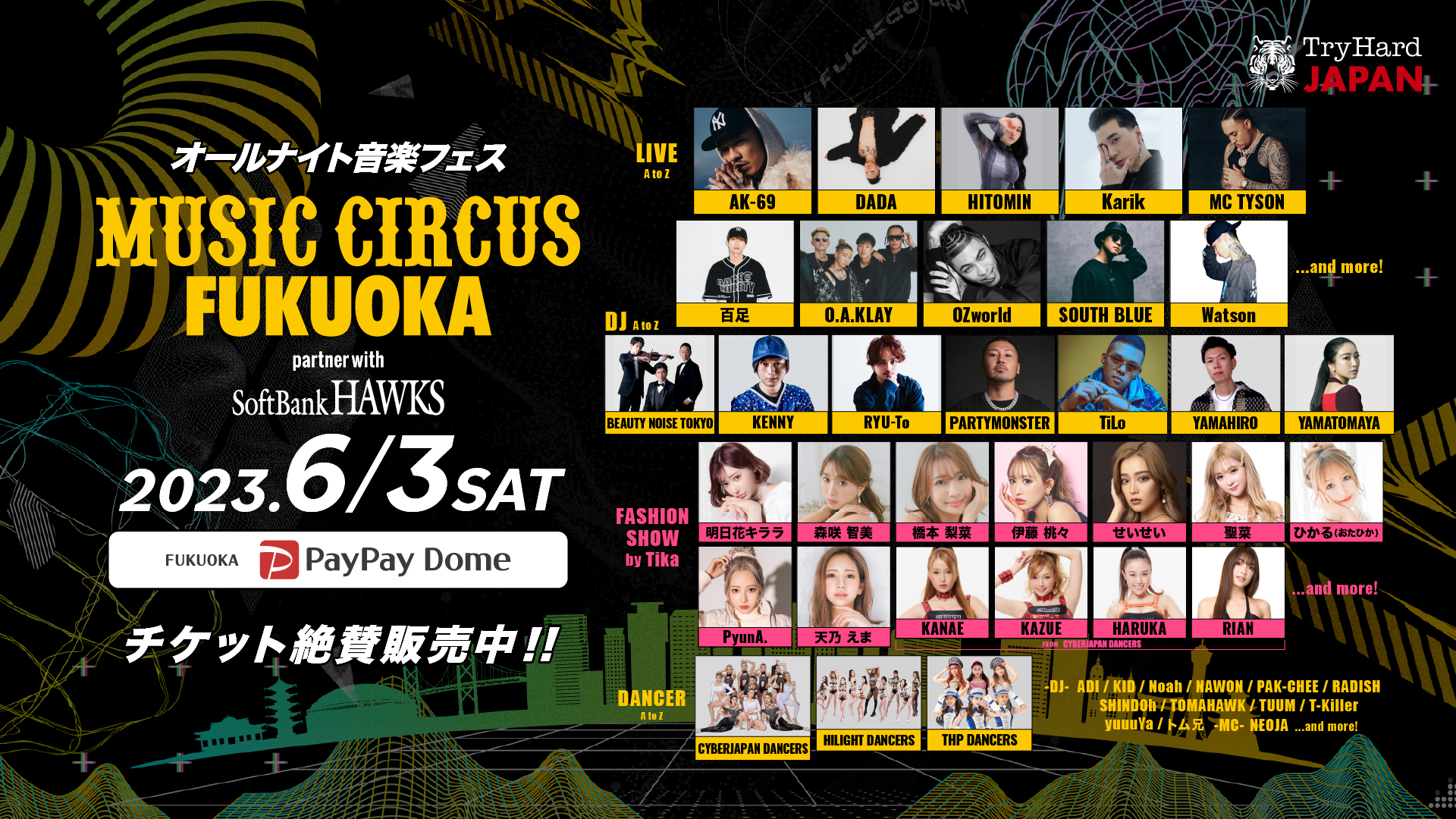 『MUSIC CIRCUS』は、2014年に大阪で誕生した、音楽のほかファッション、グルメ、スポーツなどのコンテンツも楽しめる複合型イベント。2023年は、ベトナムと日本の外交樹立50周年、福岡市とハノイ市の友好提携15周年、さらには福岡ソフトバンクホークス球団創設85周年、ドーム開業30周年、同公演を手がける、トライハードジャパン創立10周年と、5つのアニバーサリーを迎える年となる。この年に、急速な発展と世界への躍進を見せるベトナムエンターテインメントが、福岡PayPayドームに旋風を巻き起こす。