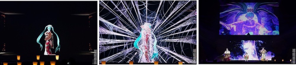 初音ミクは全盛を誇る傾城・七綾太夫役を艶やかに、くっきりと演じる。拍子舞、しっとり唄い踊る姿も、指先まで美しい! 獅童演じる保輔が、「お前の心を盗みに参った」と口説くように見せかけて七綾太夫を斬る場面は、驚きの展開。太夫の亡魂と女郎蜘蛛が合体し、発光しながらみるみる隈取が現れ、悪へと変化していく場面は圧巻だ。この初音ミクの闇落ち、悪役は同作の大きな見どころ。バーチャル・シンガー鏡音リン&レンの大薩摩(勇壮な唄と三味線演奏)も物語を大いに盛り上げる。