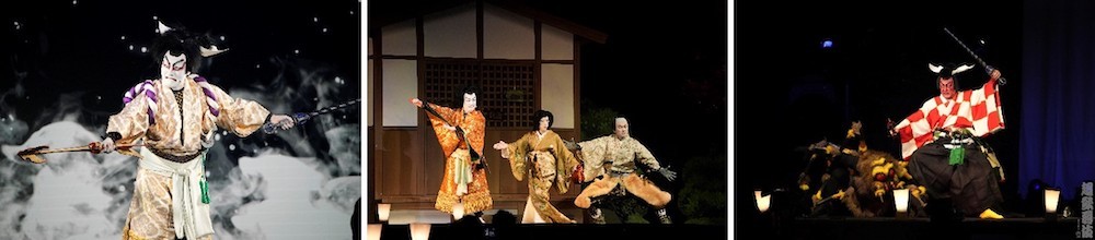 今回再演された『御伽草紙戀姿絵(おとぎぞうしこいのすがたえ)』は、土蜘蛛伝説(つちぐもでんせつ)が題材。七綾太夫(ななあやだゆう)と、源頼光(みなもとのよりみつ)の恋を軸に、日本を魔界にしようと企む女郎蜘蛛(じょろうぐも)の精や山姥茨木婆(やまんばいばらぎばば)といった物の怪たちの野望の顛末と、勇ましい平井保昌(ひらいのやすまさ)と袴垂保輔(はかまだれやすすけ)兄弟の活躍を描き、壮大な悪との戦いが展開。獅童は、七綾太夫に想いを寄せる気品漂う源頼光と、荒々しい盗賊・袴垂保輔という対極的な二役を演じ、その演じ分けも鮮やか。お家のため、化物退治のため、保輔が命を捨てる場面、心の奥底に隠していた思いを兄に吐露する台詞は涙を誘う。中村蝶紫の妖気漂う山姥茨木婆役は存在感たっぷりだ。澤村國矢演じる頼光の重臣・平井保昌役は大きく、颯爽としたかっこよさ。清々しい奴萬平の中村獅一は、立廻りの手を付ける立師でも活躍した。様式美をしっかり見せながら工夫を凝らした立廻りや、バク転、宙返りなど、アクロバティックな技を生き生きと見せる俳優たち、また、華やかに舞い踊る女流舞踊家たちと、超歌舞伎ならではの多彩な顔ぶれが揃った座組は心躍る。