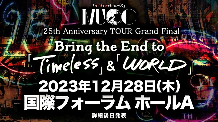 MUCCが、2023年12月28日(木)に東京国際フォーラム ホールAにて、ワンマンライヴ『MUCC 25th Anniversary TOUR Grand Final Bring the End to「Timeless」&「WORLD」』を開催することが決定した。