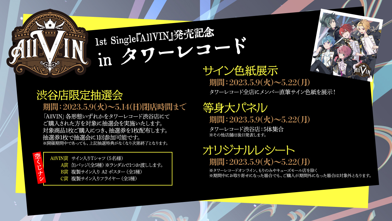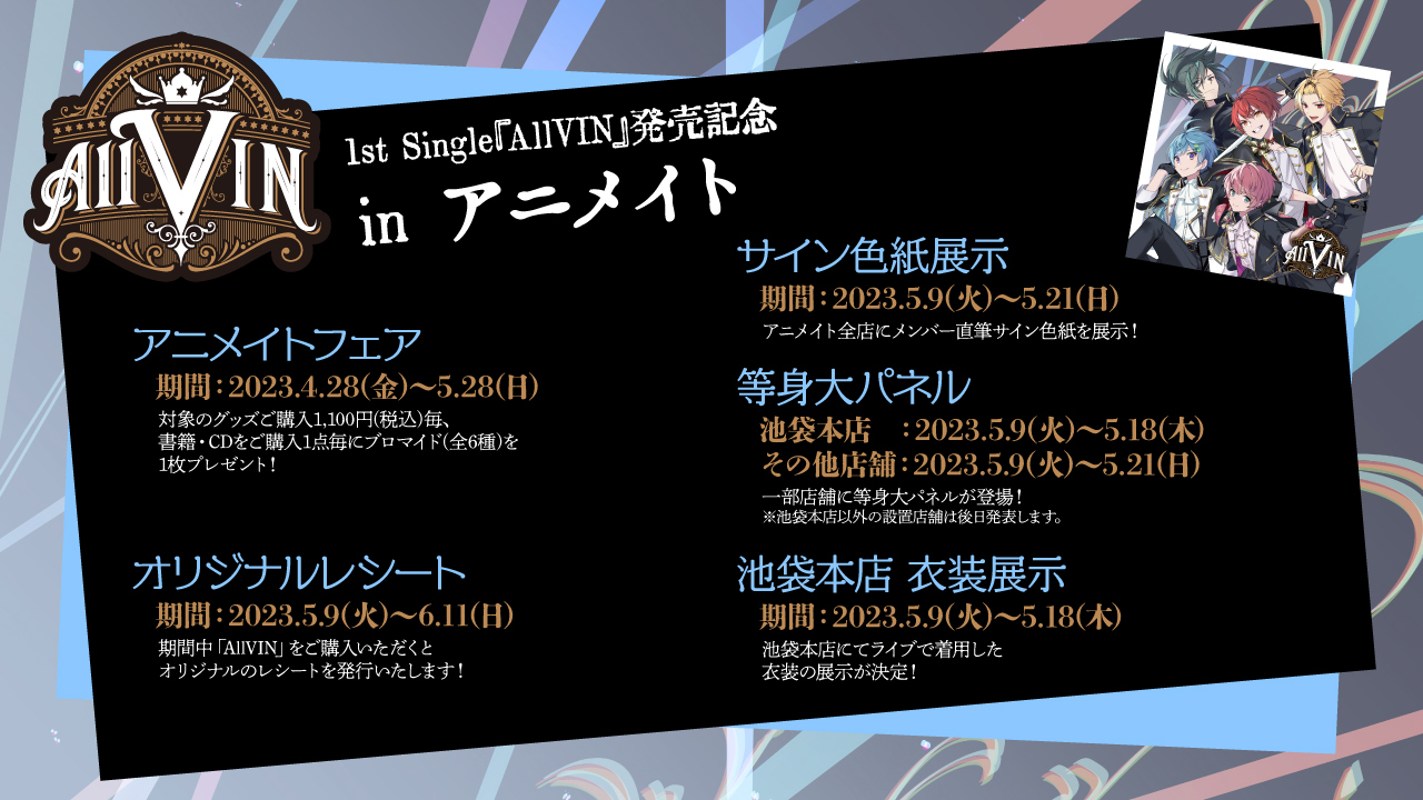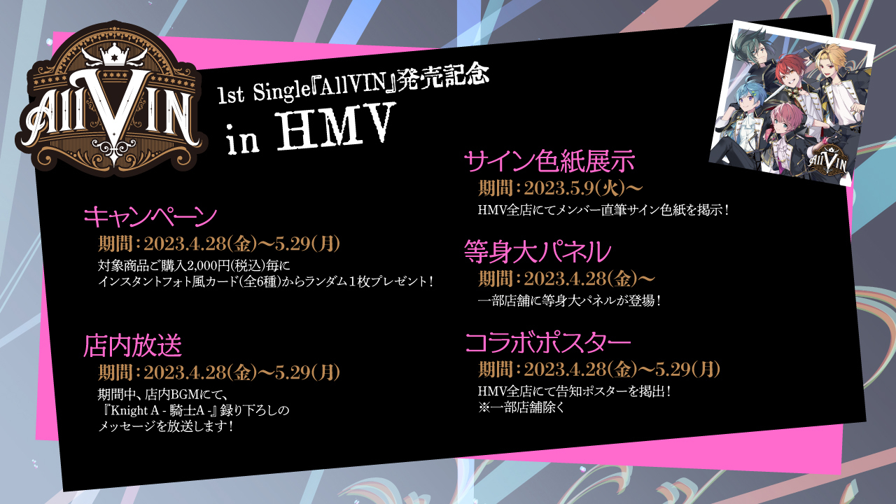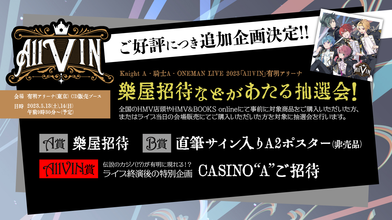 Knight A – 騎士A -は、シングル「AllVIN」を携えた2DAYSワンマンライブを5月13日(土)・14日(日)には有明アリーナで開催。ライブでは、初の花道やスタンドトロッコの演出、1日目と2日目でライブの世界観を変えるという新たな挑戦も行われるとのこと。また、ライブ当日会場では、1stシングル「AllVIN」購入者に向けた楽屋招待や限定イベントなどが当たる抽選会なども予定されている。チケットは現在先着受付中だ。