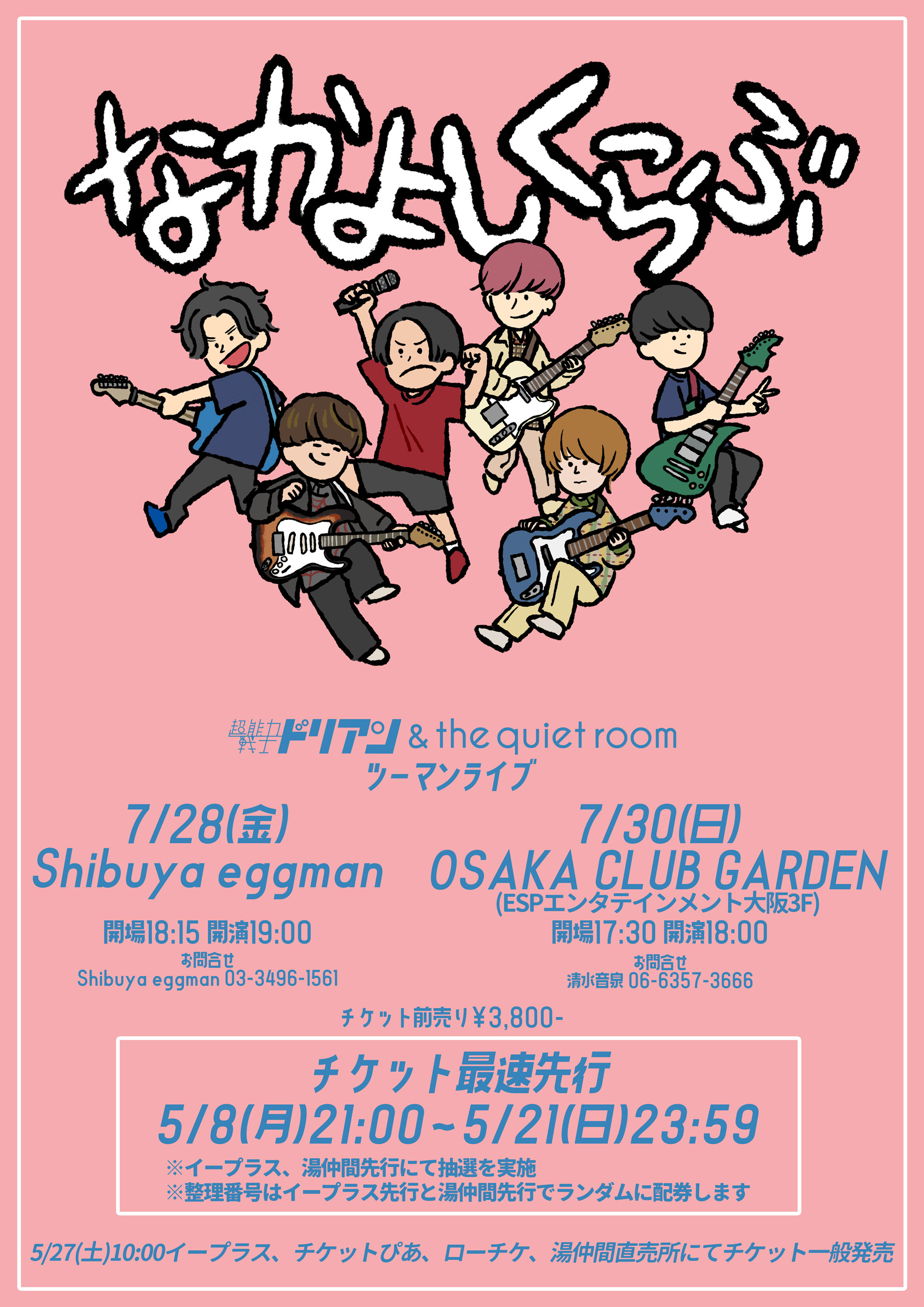 超能力戦士ドリアンとthe quiet roomが、7月28日(金)東京・Shibuya eggmanと、7月30日(日)大阪・CLUB GARDEN(ESPエンタテインメント大阪)にて、ツーマンライブ「なかよしくらぶ」を開催する。