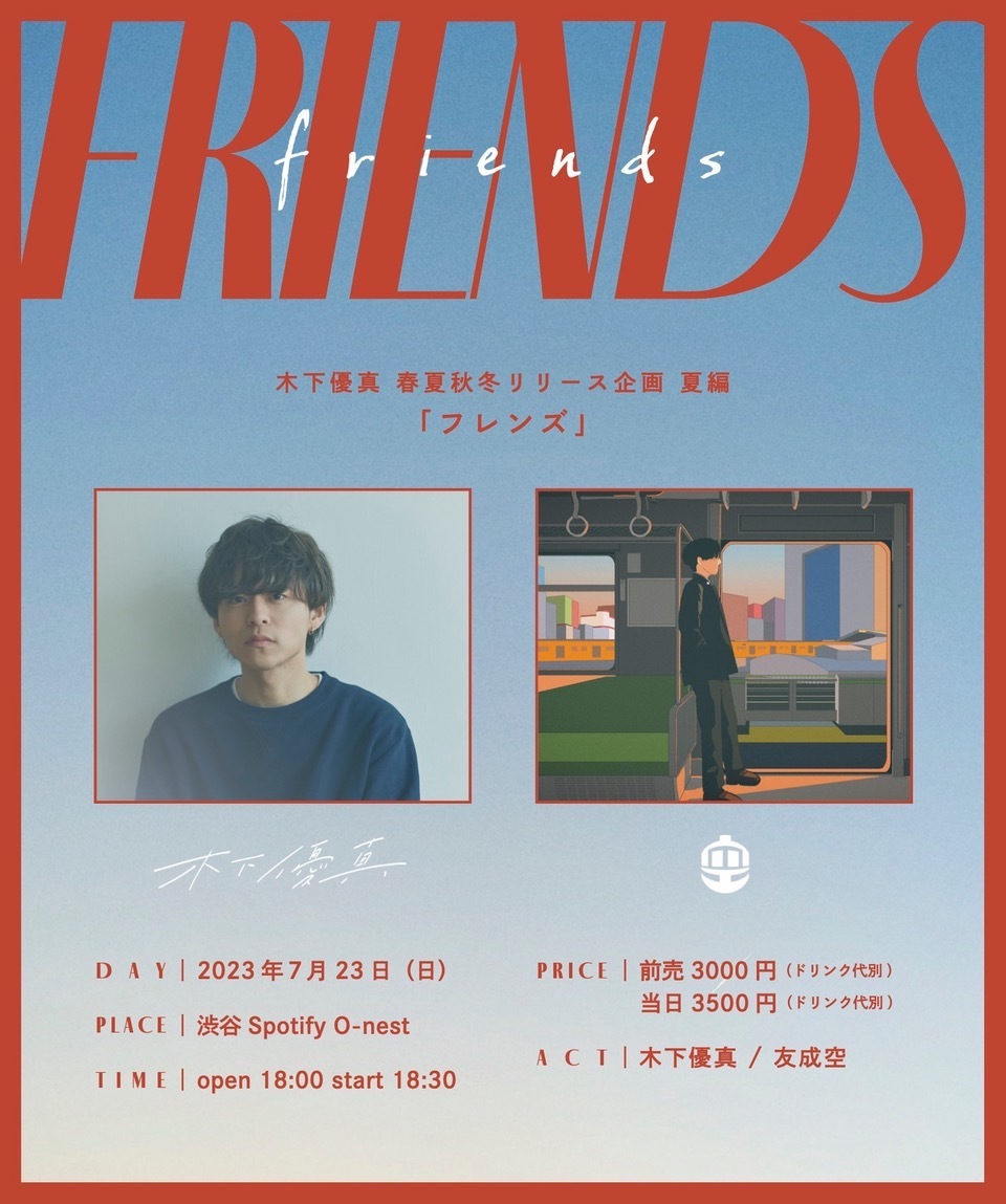 2023年4月29日に自身初となる東京でのバンドワンマンライブを成功させた木下優真が、2023年7月23日(日)に『木下優真 春夏秋冬リリース企画 夏編「フレンズ」』をSpotify O-nestにて開催することが決定した。