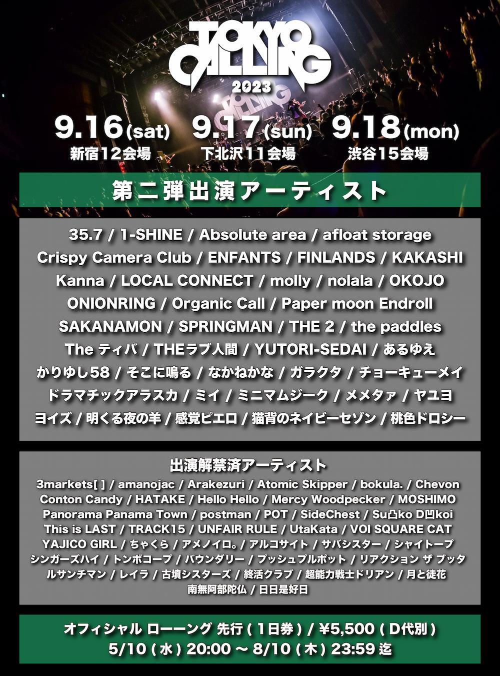 9月16日(土)~9月18日(月)にかけて、新宿、下北沢、渋谷の全38会場で開催される日本最大級のサーキットフェス『TOKYO CALLING 2023』の出演者第二弾が発表された。今回発表されたのはFINLANDS、SAKANAMON、かりゆし58、なかねかな、感覚ピエロ、Organic Callら39組。