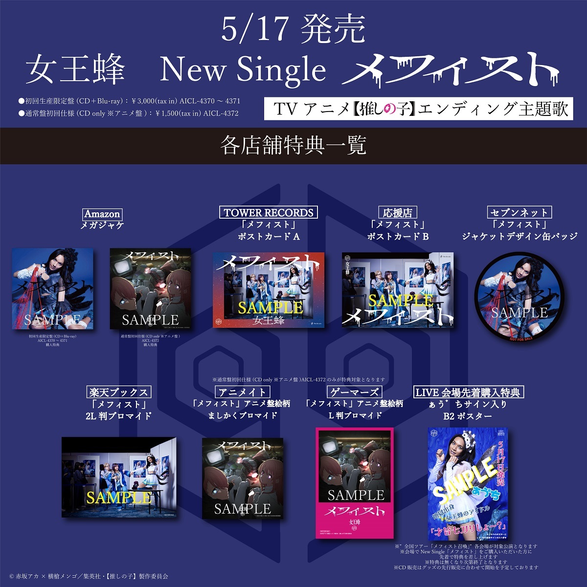 ニューシングル「メフィスト」は、先ほど第5話の放送が終わったばかりのTVアニメ『【推しの子】』エンディング主題歌となっている楽曲で、来週5月17日にパッケージ発売となる。