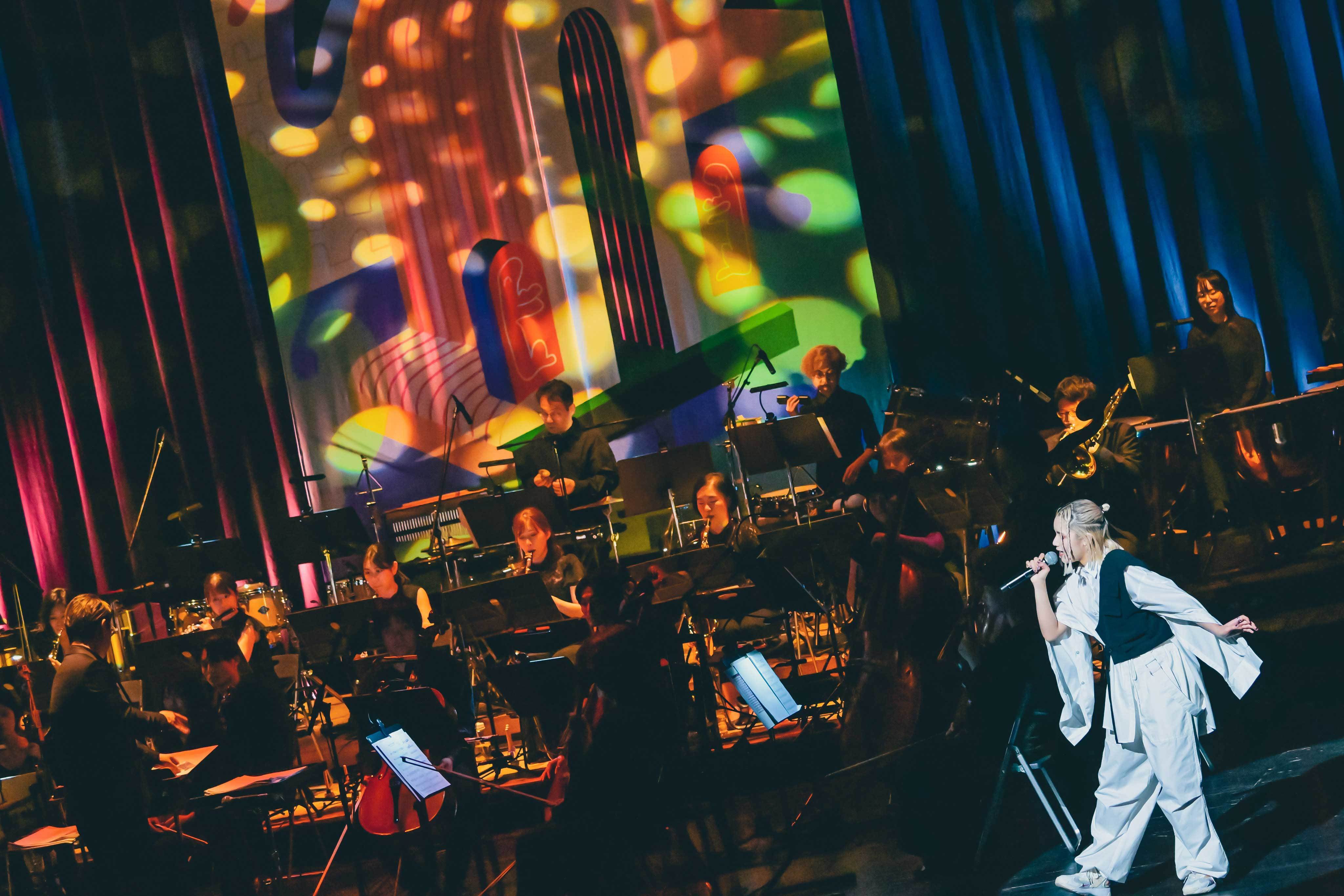 そして「このプロジェクトが決まって、絶対にやろう! と最初に決めた楽曲」と紹介した「KAKKOII」へ。バイオリンの弦を指で弾いて音を出す奏法(初めて見た!)の軽やかなイントロから、じわじわと壮大に盛り上がっていく構成だ。この曲はリハでもアレンジが「カッコ良い!」と大絶賛されていたのだが、本番はとにかく抜群にカッコ良かった。その要素の1つであり、この日のハイライトとも言えるのが、オーケストラメンバーによるクラップ&足踏みだ。アレンジャー・湖東ひとみのたっての希望で取り入れられたこの演出。1曲目の「Coffee」でもクラップは披露されていたが、そこに足踏みが加わることで低音のビートが力を増し、サウンドにエッジが出て分厚くなる。さらに後半ではサックスやトランペットの管楽器が立ち上がり、ソロプレイをバッチリ決める。松元もAnlyもノリノリで、ぐんぐん空気を動かしてゆく。Anlyは曲中では管楽器とピアノのメンバーをフルネームで紹介したのだが、初日に30人いるメンバーの「顔と名前を覚えたい」と話していた彼女の愛と努力が見てとれた。