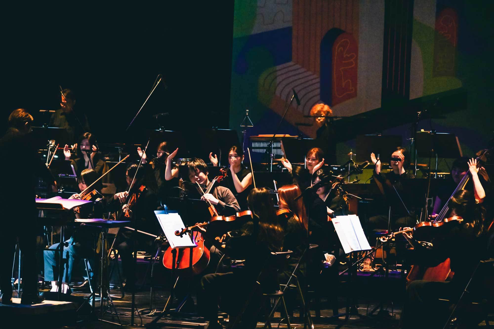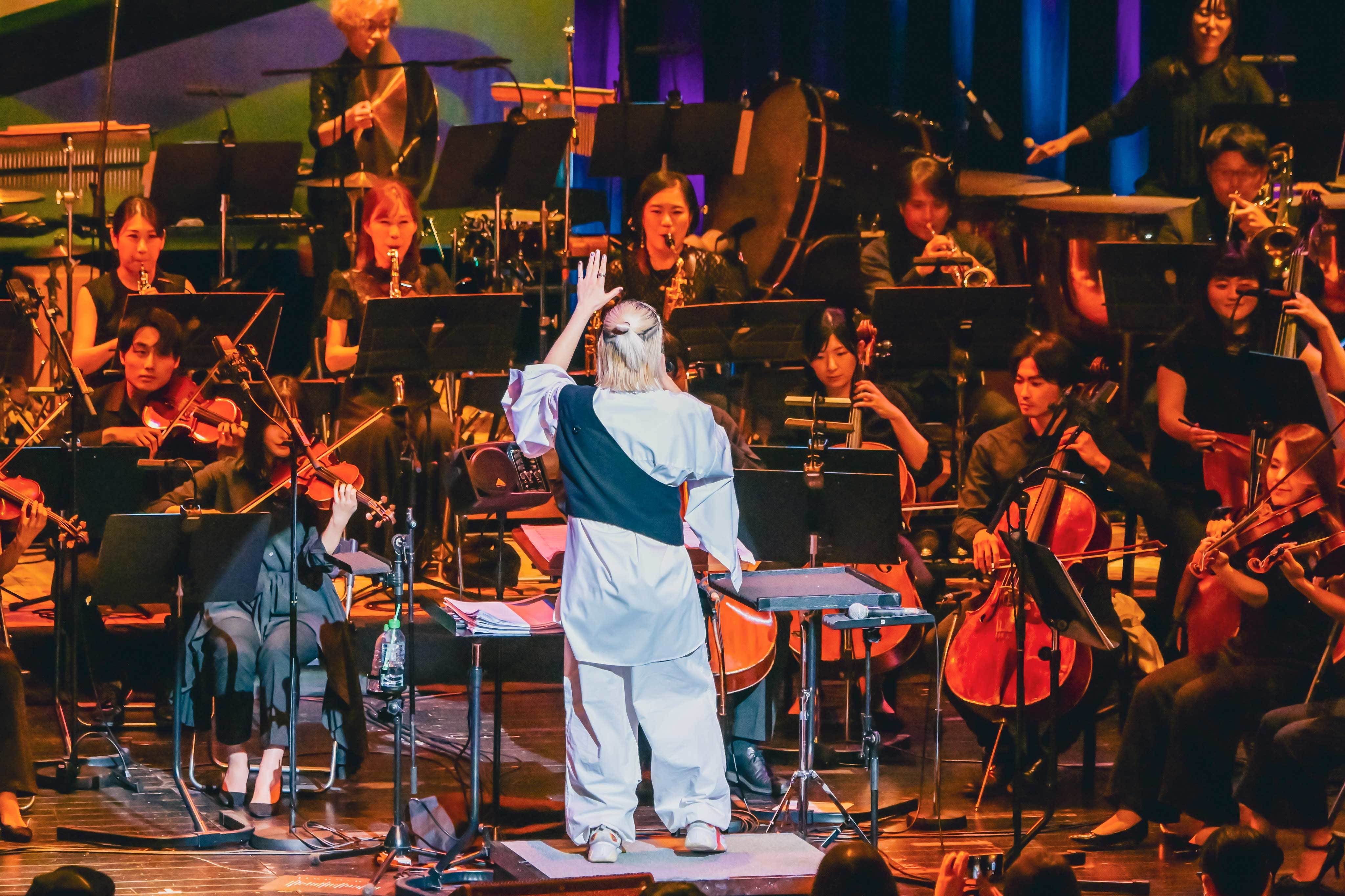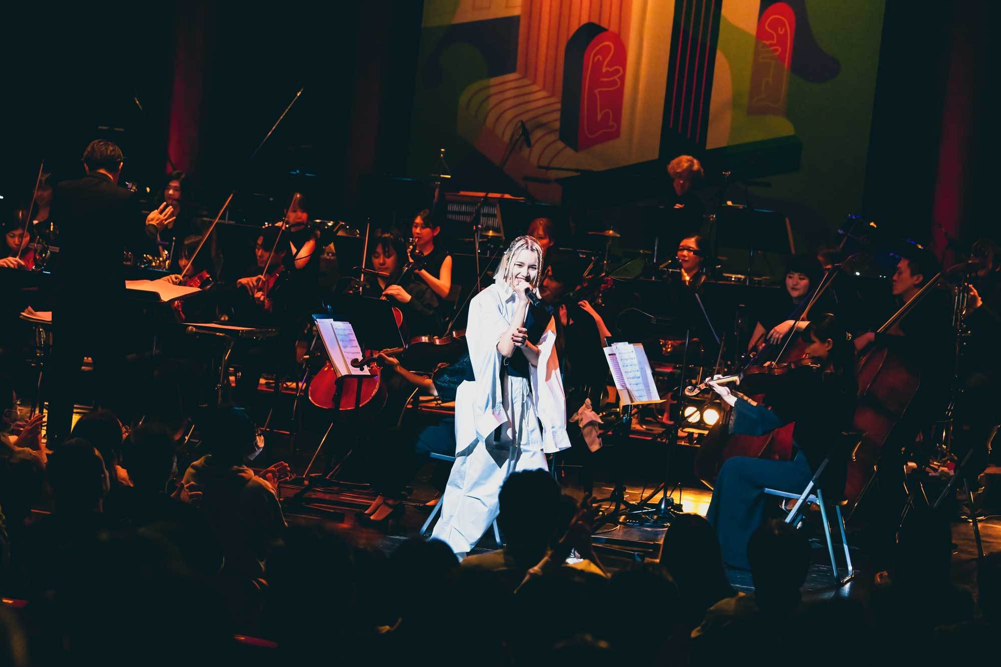 ステージ上には、アーティスト・Keeenueが描き下ろしたキービジュアルのバックドロップが吊るされている。暗めの照明でムードを高めている会場には、AnlyセレクトのBGMが流れていた(この日流れていたのは、アメリカのロックバンド、The Band CAMINO)。これは打ち合わせでAnly本人が提案したもの。いつもAnlyがライブで使用しているBGMを流すことで、初めてオーケストラを見るAnlyファンがリラックスできるように、また普段オーケストラを見慣れている人がAnlyのライブの雰囲気を感じてもらえるようにとの意図が込められている。とはいえ、厳かな劇場の力もあるのだろう。会場内には少しだけ緊張感が漂っていた。