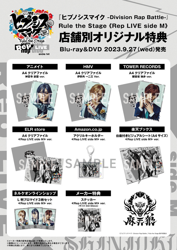 アニメイト、HMV、TOWER RECORDS、ELR Storeではそれぞれ、“麻天狼”主演キャストの扮装ビジュアルを使用したA4クリアファイル、Amazonではアクリルキーホルダー、楽天ブックスでは台座付きビジュアルシート、ネルケプランニングオンラインショップではL判ブロマイド3枚セットが特典となるほか、メーカー特典や、HYPNOSISMIC Rule the Stage Official Storeでは限定で早期予約特典「バックステージパス風 クリアカード3枚セット」を手に入れることができる。