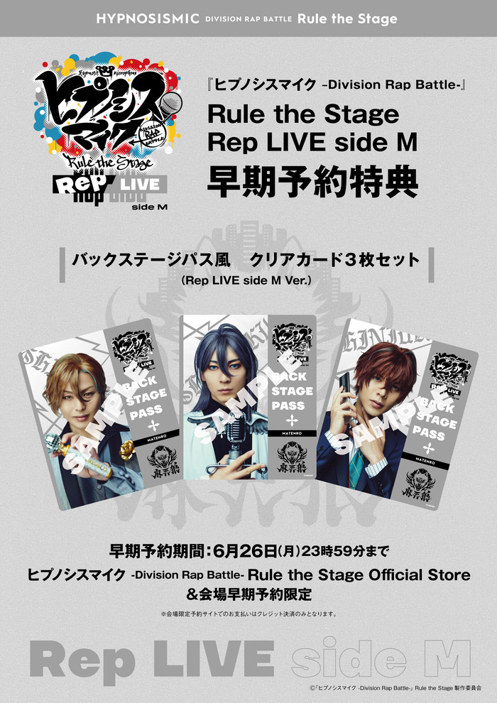 『ヒプノシスマイク -Division Rap Battle-』Rule the Stage《Rep LIVE side M》公演会場で本Blu-ray&DVDを予約した方にはその場で、「バックステージパス風 クリアカード3枚セット」をプレゼントされることも決定している。