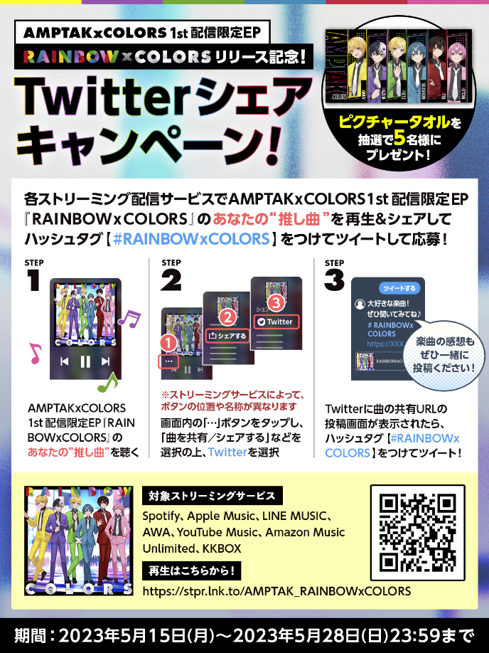 なお、EP配信を記念して、抽選で5名にピクチャータオルがプレゼントされるTwitterシェアキャンペーンが実施中。各ストリーミング配信サービスで『RAINBOWxCOLORS』の“推し曲”を再生し、Twitterで「#RAINBOWxCOLORS」をつけて、感想とともにツイートすることで応募することができる。