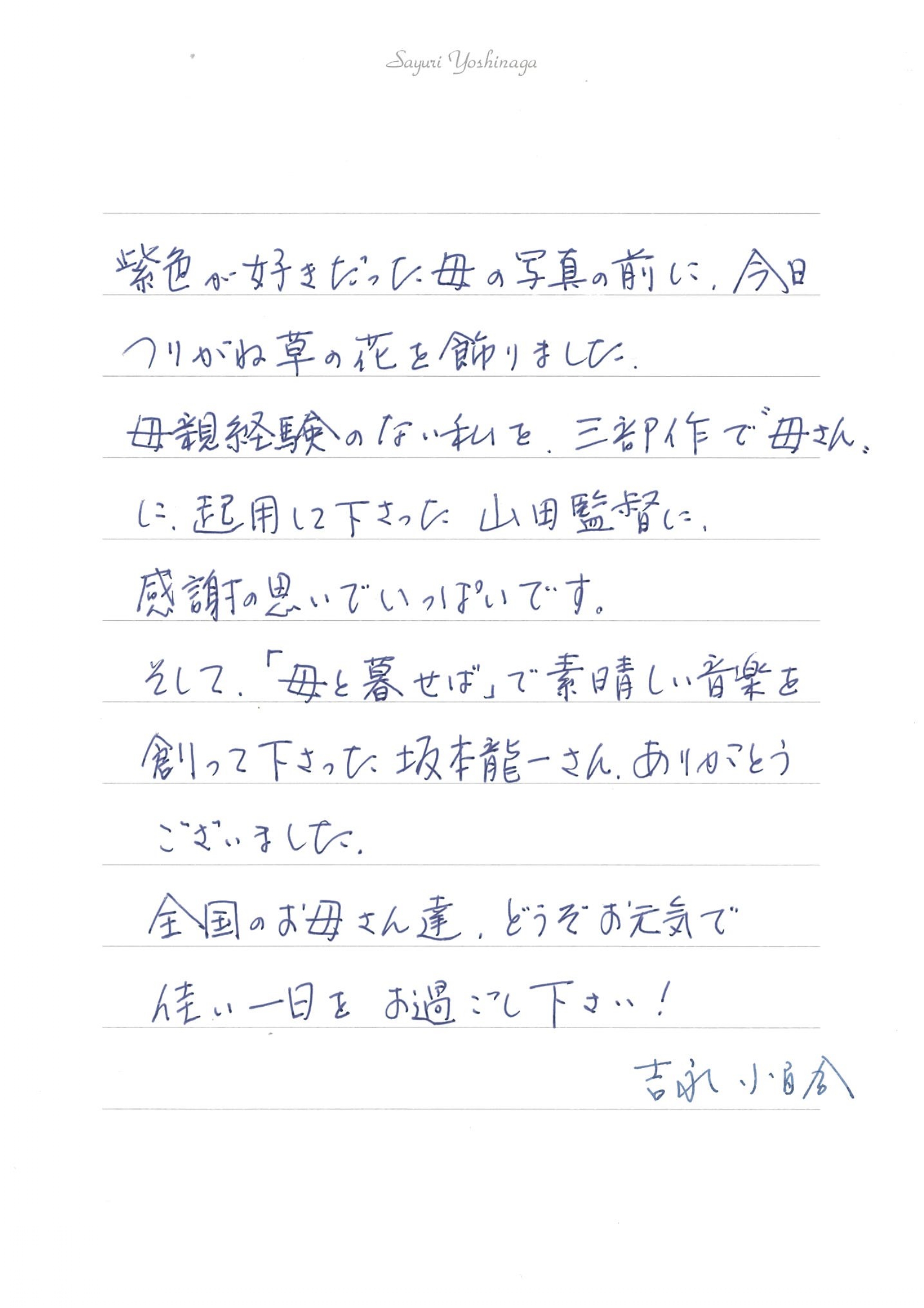 くわえて、5月15日の母の日に寄せて、“日本全国のお母さん”に向けた吉永小百合直筆のメッセージも公開。亡くなった坂本龍一さんへの感謝の言葉も添えられている。