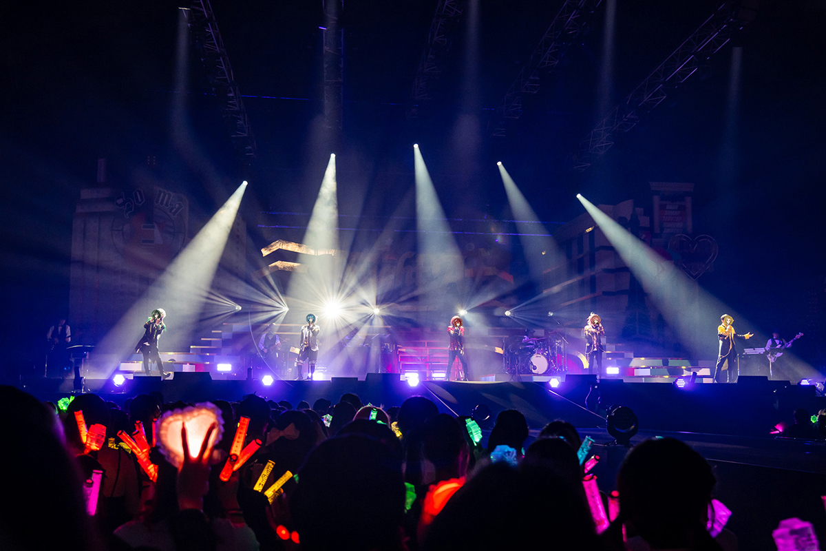 挑発的な自己紹介で5人が順繰りかっとばしていく「Knight Game」で大ボリュームのコール&レスポンスを轟かせたあとは、それぞれのメンバーカラーのジャケットやトップスをまとった5人がサングラスをかけてステージ下からリフターで登場。さながらCASINOに訪れた遊び慣れた客を連想させる装いだ。バンドメンバーに楽しそうに絡む場面も見られた「ヒバリ」。吐息混じりの歌声でもドキドキさせた、ドラマティックで退廃的な「『A』BYSS」。マイクスタンドを前に、歌声をていねいにつなげて重ねていった「Dreamy Night」。再びトロッコに乗り込み、<特別な笑顔>で客席に向け手を振ったり指さしたり、たくさんのファンサをした「Thirsty」。そして、ばぁうがタイトルコールした本編ラストの曲は「V Ace」だ。<俺だけみてろや今><俺だけのお前に>、こんな強気で俺様なフレーズが、騎士Aにはよく似合う。花道やセンターステージも使ってオーディエンスを虜にした5人の<俺たちが“Knight A”>も、誇らしげに響いた。