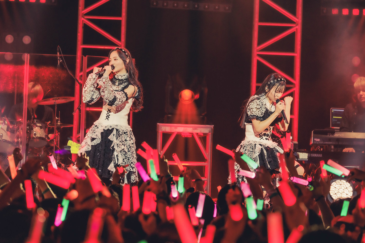 クールな表情から一転、満面の微笑みを向けてそう語ると、ハッピーなロックサウンドが響く。スタートしたのは「新世界ビーナス」だ。サウンドに負けじとハイテンションに振る舞うクララとカレン、その姿にこちらもアッパーな気持ちにさせられる。二人が会場に向け、ペンライトを指揮棒のように振ると、観客もそれにあわせて身体を揺らす。全身で音楽を楽しんでいることが視覚的にも感じられる瞬間だった。