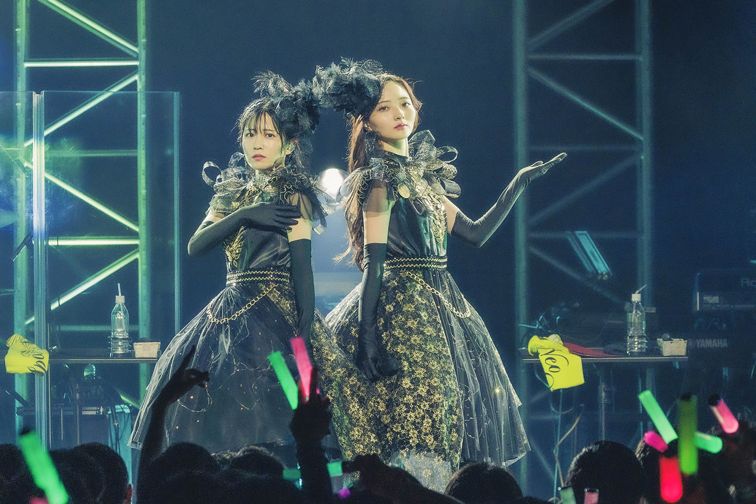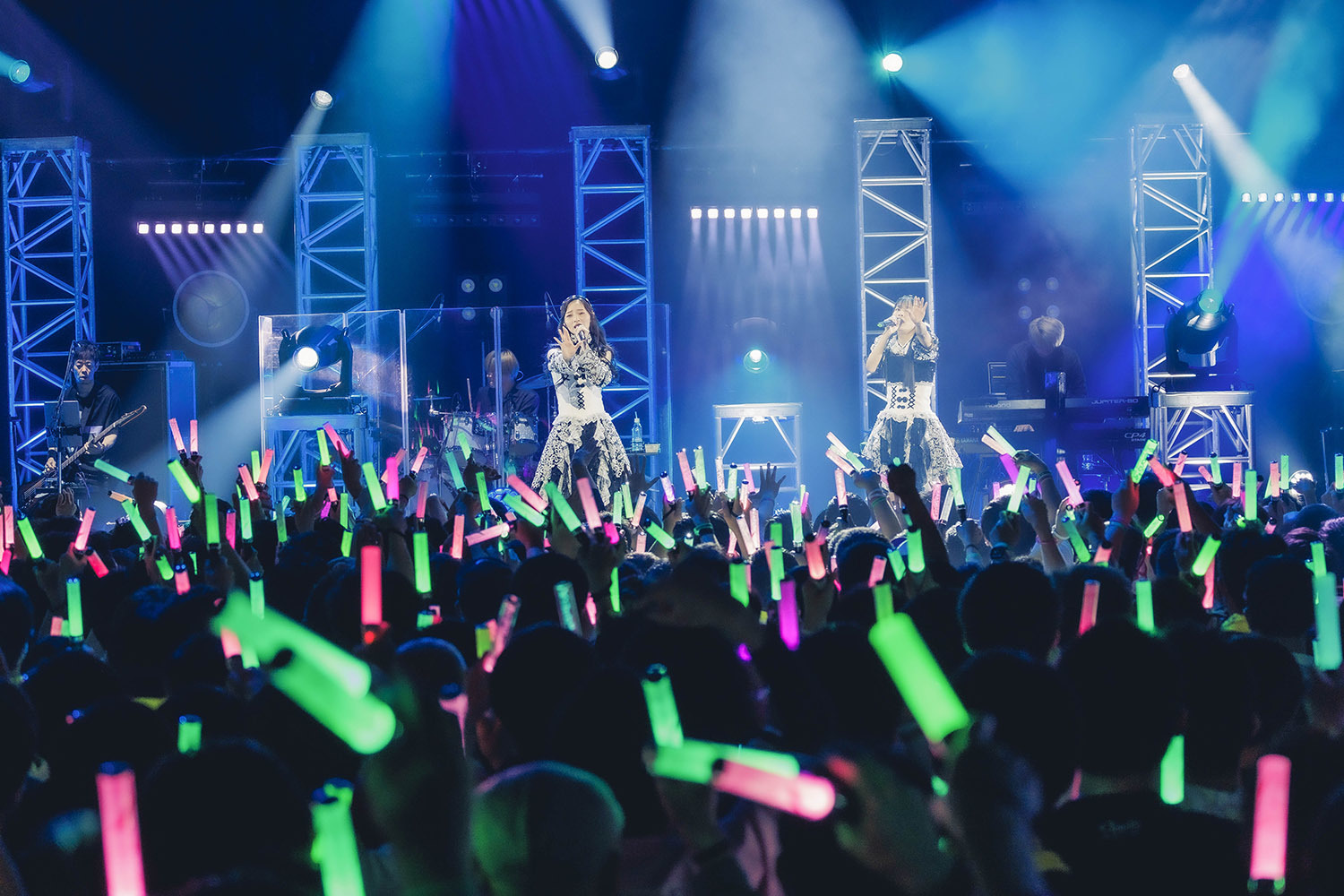 二人が観客に背を向け、一瞬の静寂が訪れる。そこにエレクトロニカルなサウンドが流れ出すと、照明が近未来を想起させるような輝きを見せる。始まったのは「パラレルワープ」だ。ダンサブルなナンバーに観客が心地よく体を揺らすと、二人がクールに歌声をのせる。