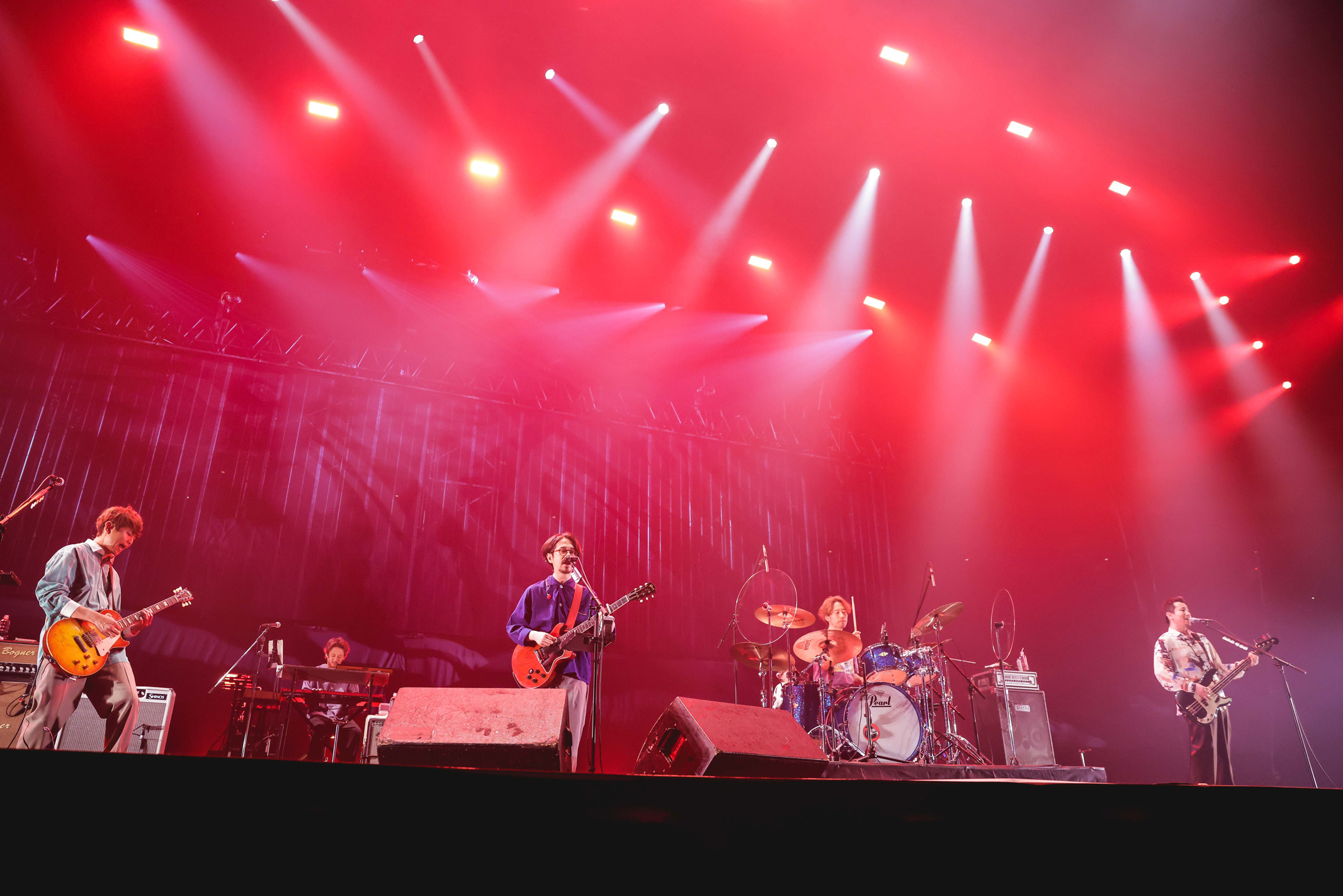 穴見真吾(Ba)は嬉しそうにジャンプし、小林壱誓(Gt)はステップを踏みながら、peppe(Key)も笑顔でとても楽しそうに演奏する。そして「今日はみんなのリクエストを元にセットリストを作ってるんですけど、新しい私たちも知ってほしい」と、5月にリリースされる最新アルバム『pink blue』から「White Rabbit」を披露。美しくも情熱的なミディアム調のバラードで、どこかノスタルジックな雰囲気を漂わせる。さらに「ミチヲユケ」では、天井の高さを存分に活かした大迫力&妖艶な照明演出で楽曲の世界観を奥深く描き出した。