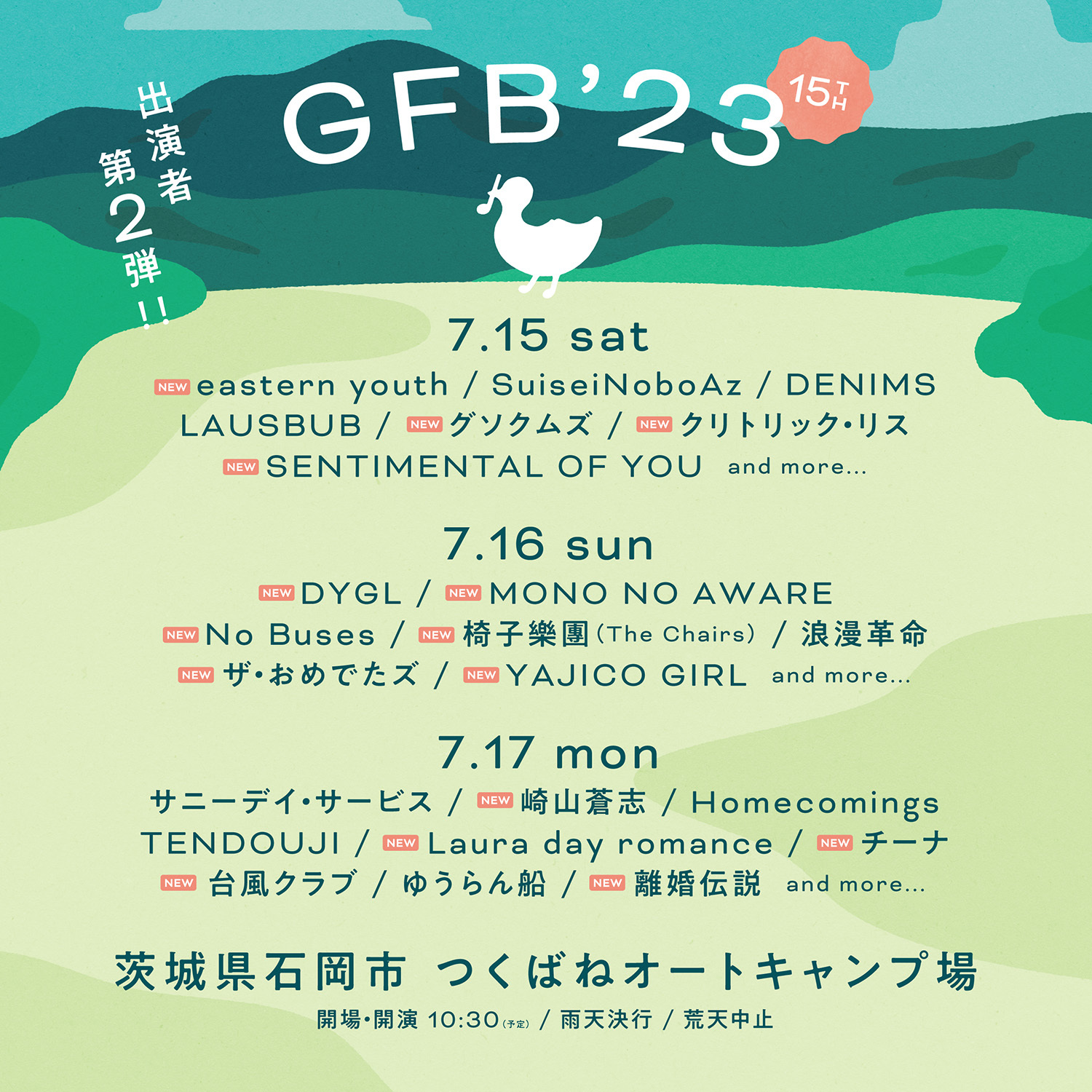7月15日(土)・16日(日)・17日(月・祝)の3日間にわたり、茨城・つくばねオートキャンプ場で開催される『GFB’23(つくばロックフェス)』の第二弾出演アーティストと日割りが発表された。