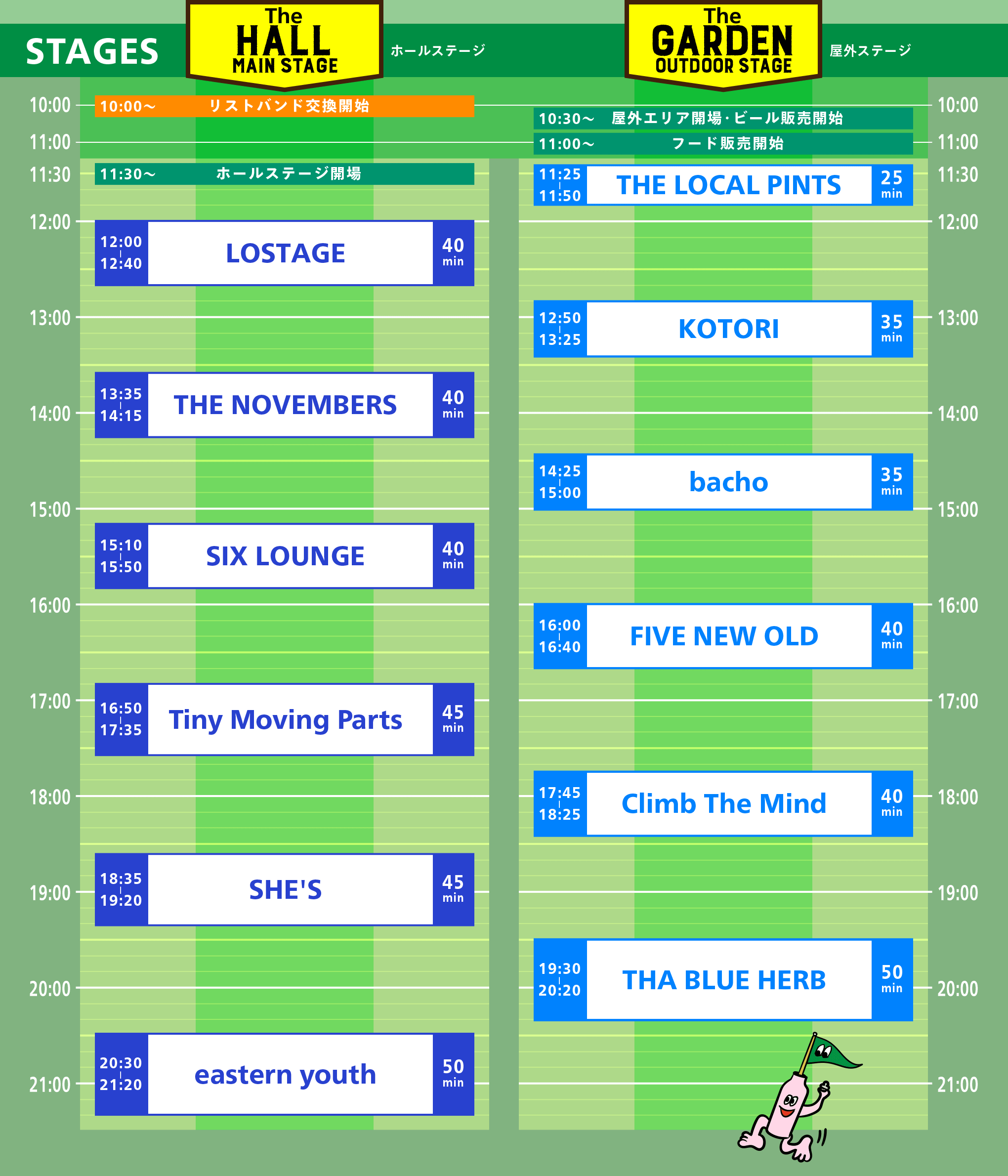 1日目のラインナップにオルタナ、エモ系が多いのは、僕がすごくエモが好きだからなんですけど、そこにTHA BLUE HARBみたいなアーティストもいて、いいスパイスになっていると思います。eastern youth、KOTORIとか、わりとお馴染みのバンドが多いですけど、その中に1組来日バンドがいて。ミネソタのTiny Moving Partsという、エモっぽい疾走感あるオルタナロックバンドです。3月の終わりにジャパンツアーがあったんですけど、僕のやっているCRAFTROCK BREWINGでコラボビールを作って販売した経緯があって、「また5月に日本に来てくれないか」とお誘いしたらOKしてくれました。とてもいいバンドなので、注目してほしいです。あと個人的にすごく好きなのがClimb The Mindという名古屋のバンドで、たぶん年に数回しかライブをやらないので、かなり貴重なライブになると思います。LOSTAGEやbachoが好きな方には、すごく刺さるバンドだと思いますよ。それと、SHE’Sは一見するとポップなピアノロックなんですけど、今回はピアノエモ枠でお誘いさせていただきました(笑)。以前に日本橋のお店(CRAFTROCK BREWPUB&LIVE)で、FIVE NEW OLDのHIROSHIくんとSHE’Sのボーカルの竜馬くんがアコースティックライブをやってくれたことがあって、そこで初めて竜馬くんとお話ししたら、思いっきりエモ好きだったので。そういうきっかけもあります。あと、僕がベースを弾いているTHE LOCAL PINTSというバンドも、オープニングアクトで出させてもらいます。アメリカのビアバーでかかっていそうな曲とか、ラジオから流れるカントリー風の曲をイメージしているバンドなので、ビール好きには刺さると思います(笑)。新曲も用意して、頑張りたいなと思います。