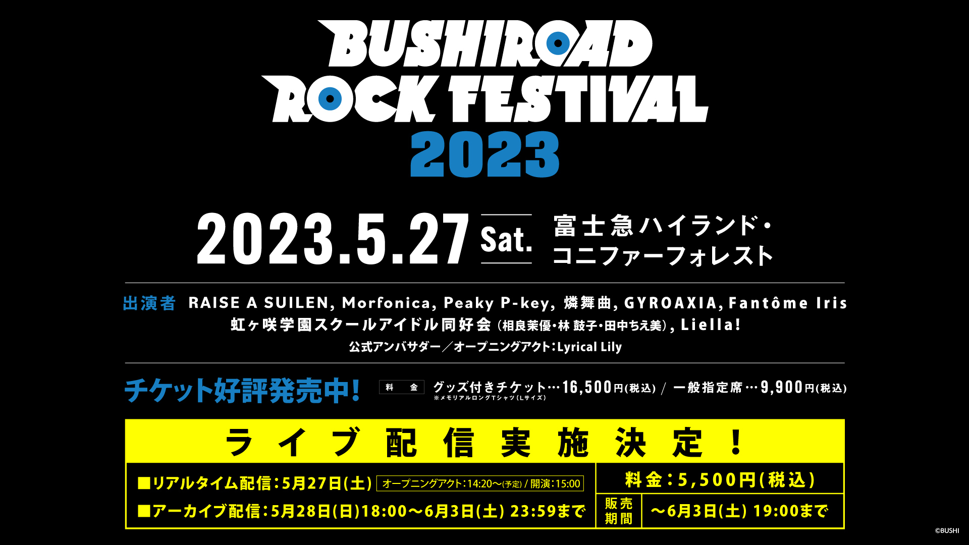 また、本配信ではリアルタイムだけでなく、アーカイブ視聴も可能。「BUSHIROAD ROCK FESTIVAL 2023」は、ライブ終了翌日の5月28日(日) 18:00から6月3日(土) 23:59にかけてアーカイブ配信が実施され、ライブ当日に収録されたバックステージ映像を特典として視聴できる。