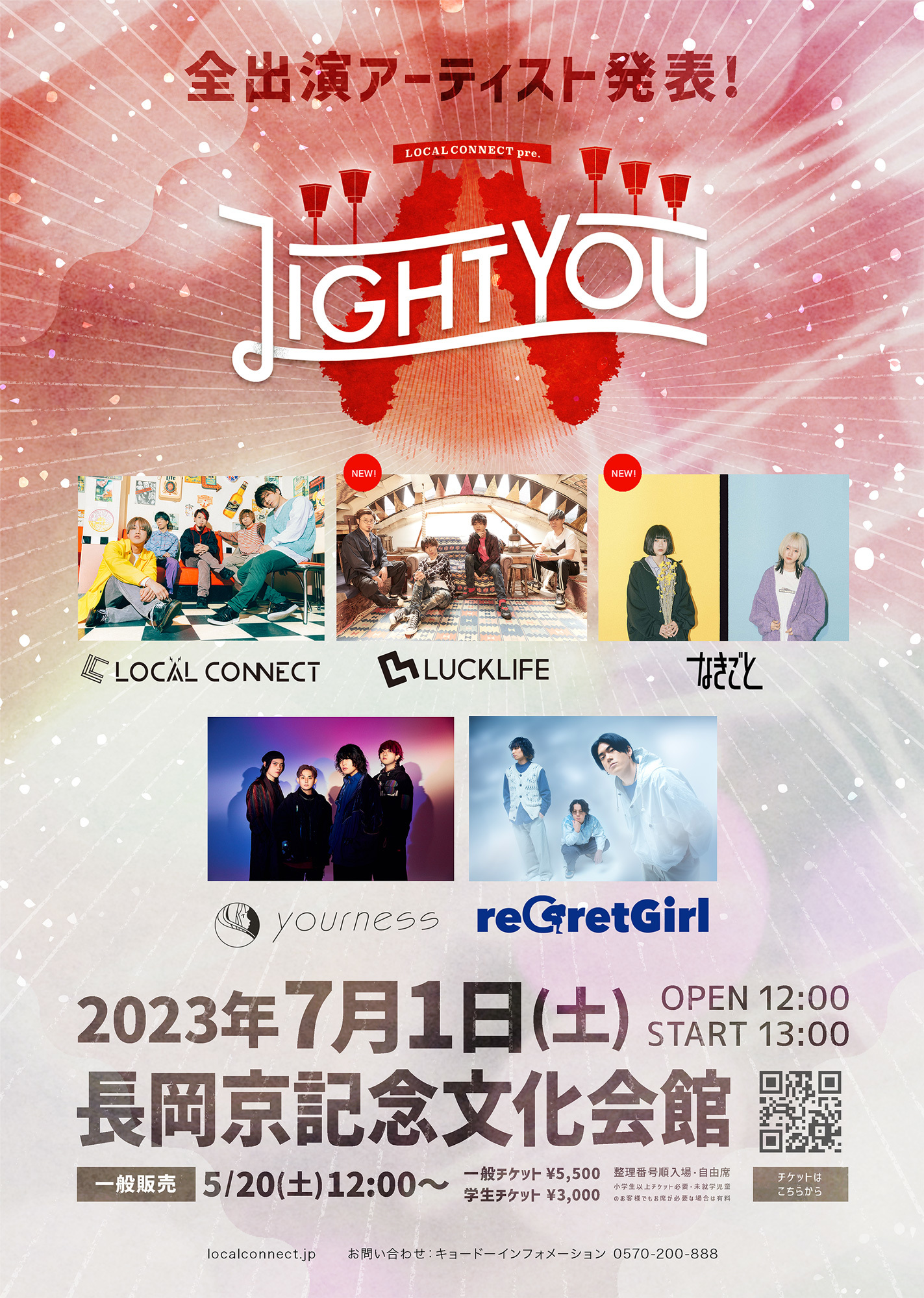 LOCAL CONNECTが、2023年7月1日(土)に、バンド結成の地である京都府長岡京記念文化会館にて開催する、初のホールイベント『LIGHT YOU 2023』の全出演アーティストが発表。ラックライフ、なきごと、ユアネス、reGretGirlの4組の出演が決定した。