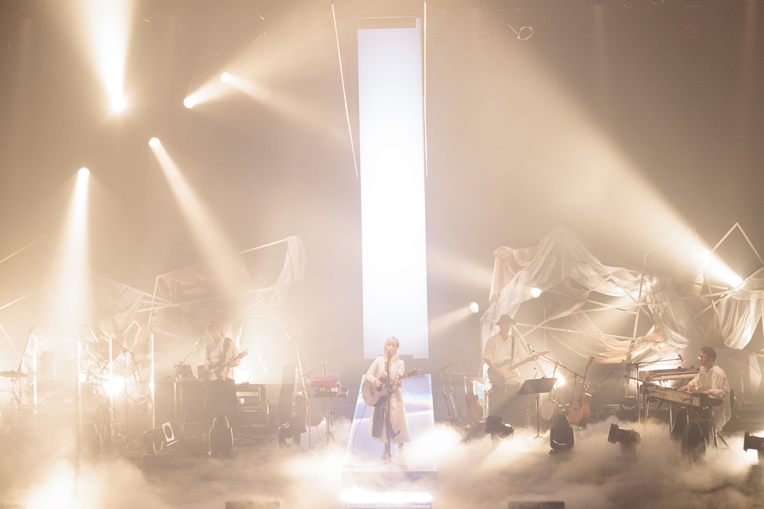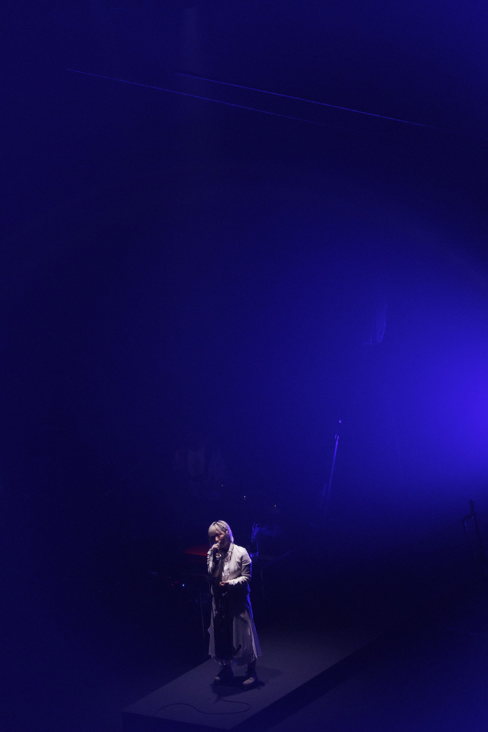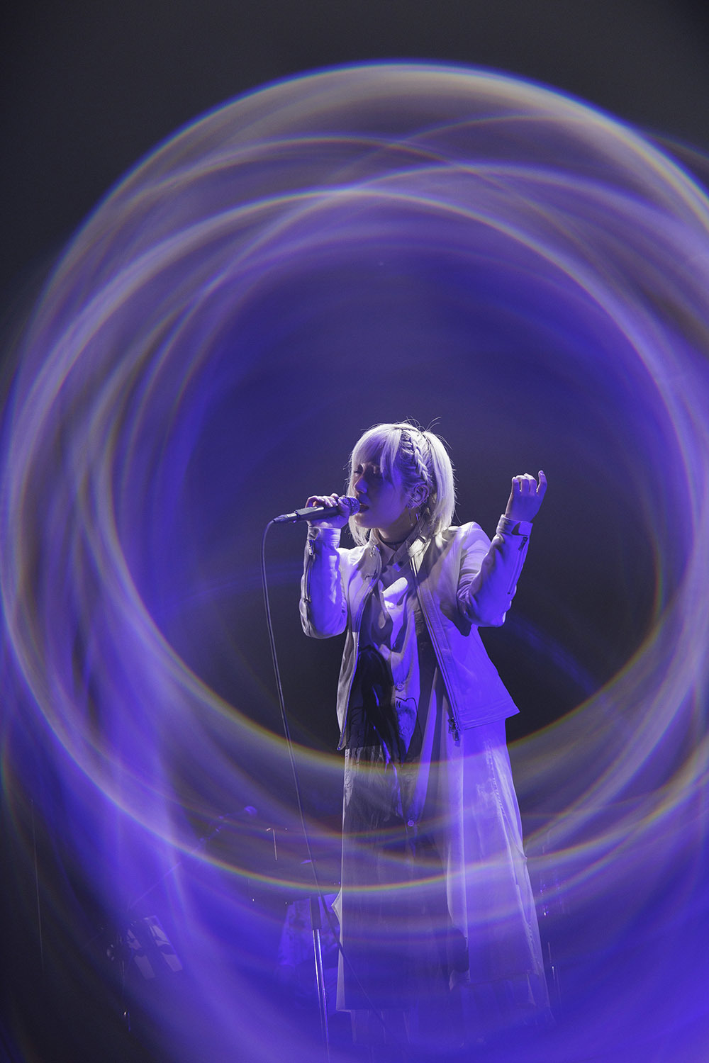 白のワンピースに白のレザージャケット、明るい髪色、全身を薄色に統一した彼女が立っていたのは、白く輝く一筋の光の上。足元に設置されていたのはLEDスクリーン、そこから真っ白な光が放たれている。そして彼女の登場に合わせてバンド隊によるサウンドが走り出す。そこに力強い歌声が合流し、本コンサートの幕が開いた。