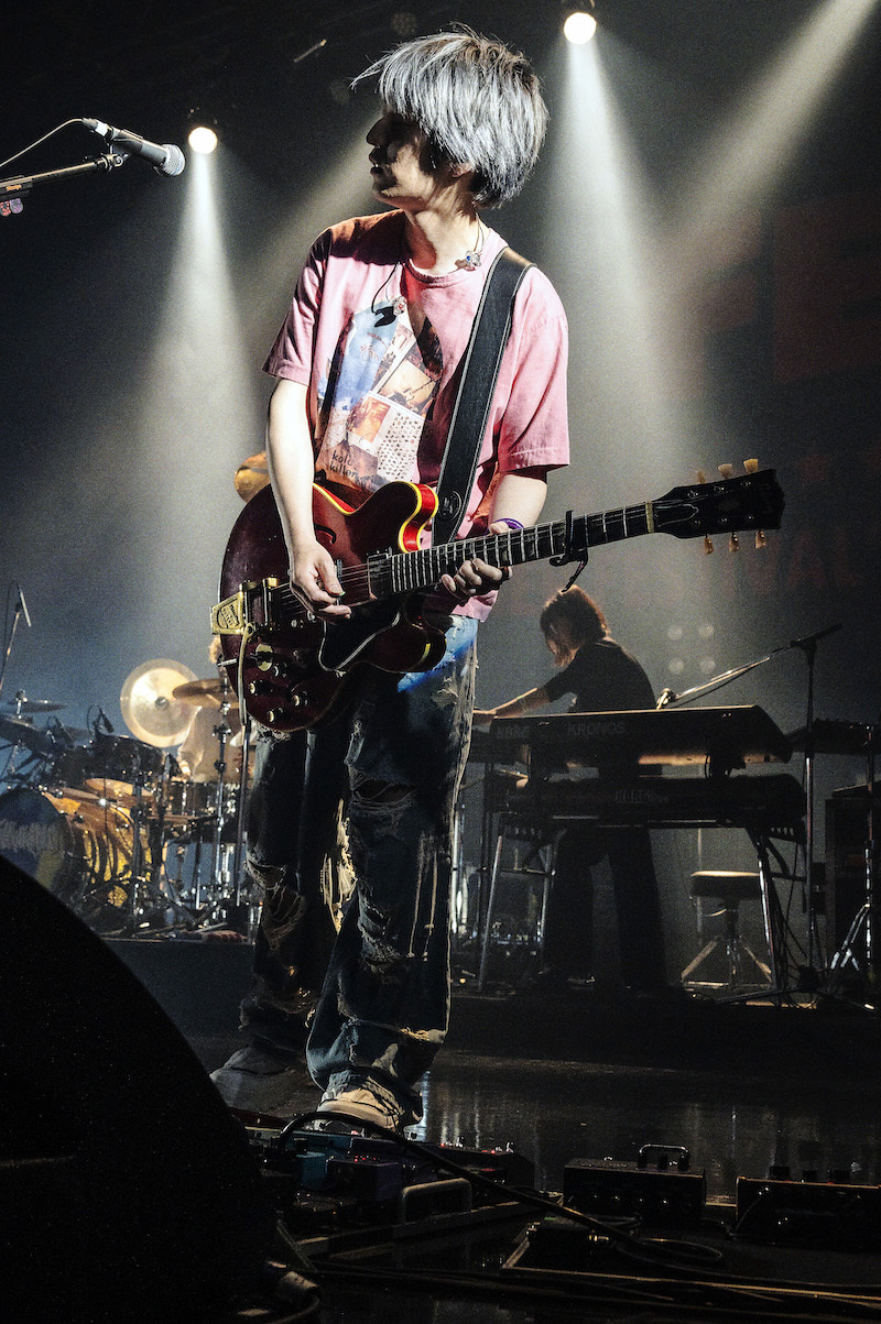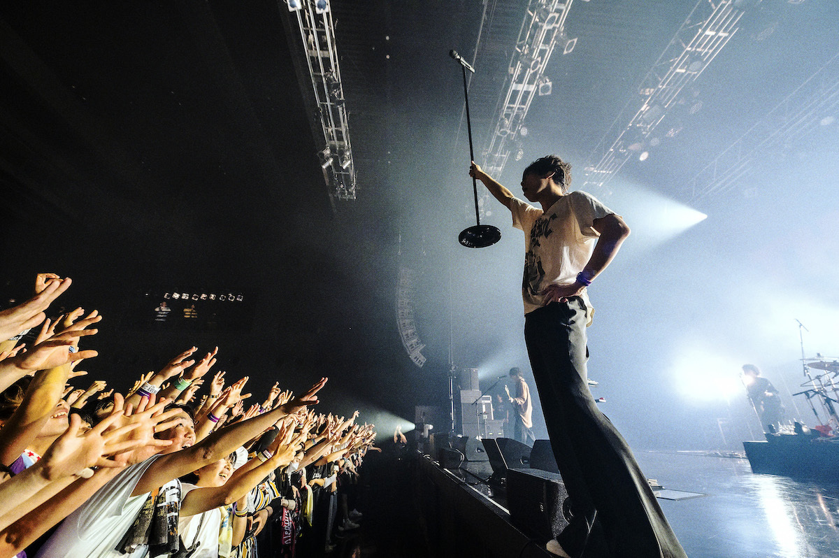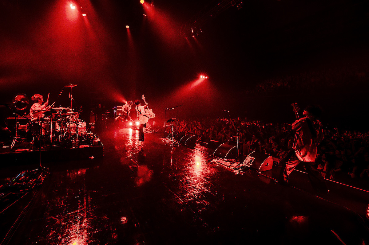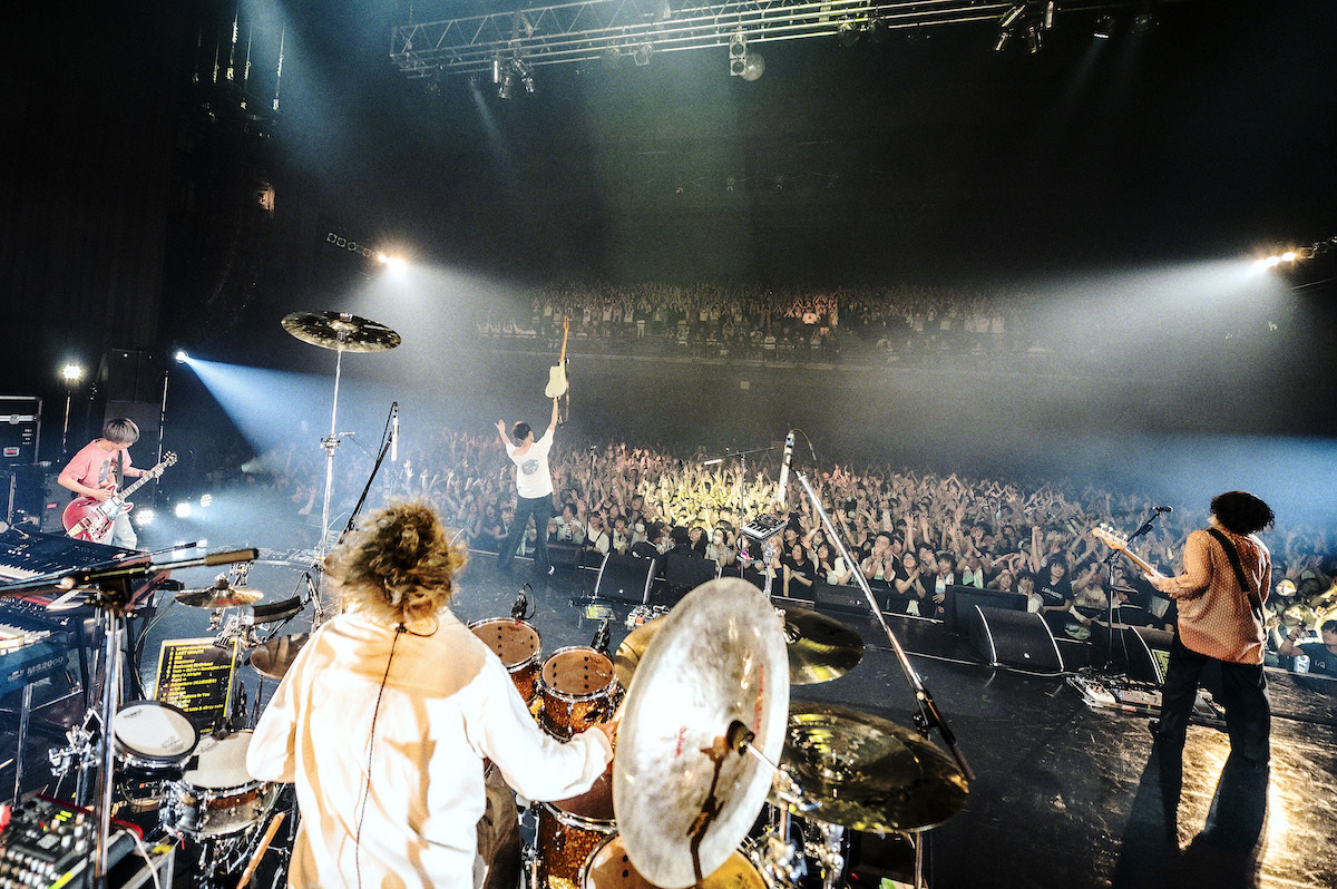 ツアー初日となるKT Zepp Yokohama公演1日目、ゲストとして登場したのはSUPER BEAVER。冒頭の「27」からエモーション全開の激演に熱く沸き返るフロアを、「始まってますけど? そんなもんっすか横浜!」と渋谷龍太(Vo)が絶唱とともに煽り立ててみせる。「突破口」では見渡す限りに観客の拳が力強く突き上がり、<威風堂々><正々堂々>のコール&レスポンスが響き渡る。「対バンの一番いいところは、メインアクトが、その一個前のアクトに影響されるってことです。俺たちがすごいのをやったら、先輩はそれを超えてこようとすると思うんで。俺たちと一緒に、最高の音楽を作りましょう!」という渋谷のMCに、拍手と歓声が広がる。