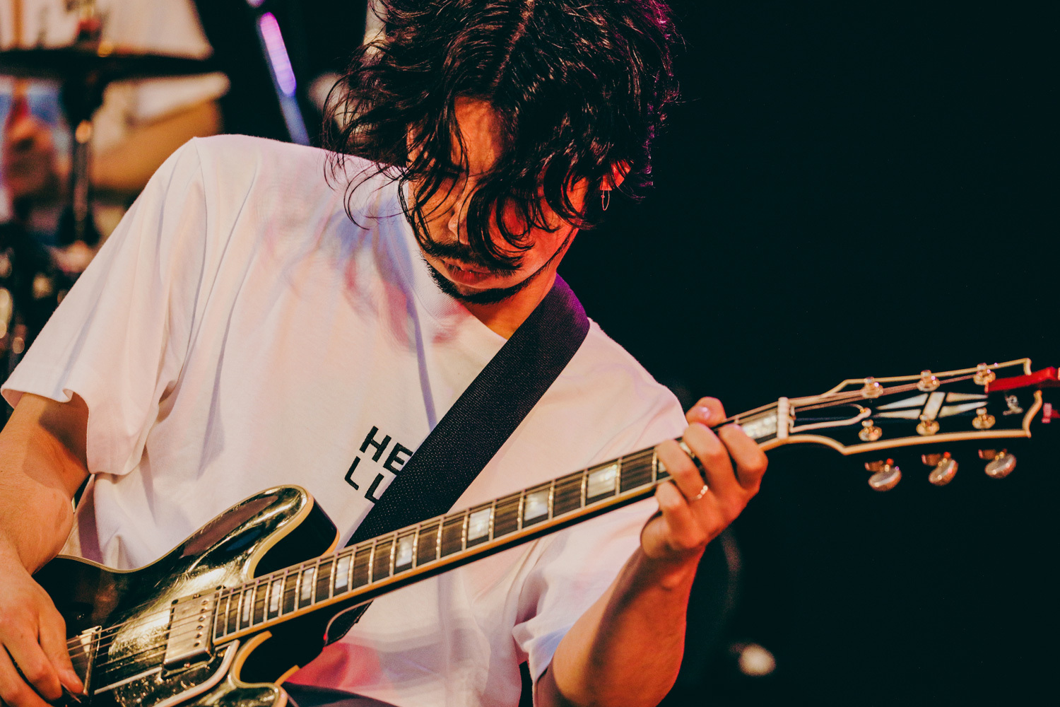 1曲目から早くもクライマックスのようなステージングを繰り広げる。続く「ムーンサルト」のサビでは一斉に客席の拳が上がるが、その熱量が半端なく高い。重たい湿気も楽曲を引き立てるエッセンスとなり、オーディエンスを夢中にさせる。石井開(Gt.Cho)とオギノテツ(Ba.Throat)によるコーラスワークもどこか野性的で、全身に突き刺さるようだ。