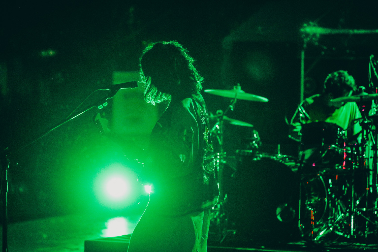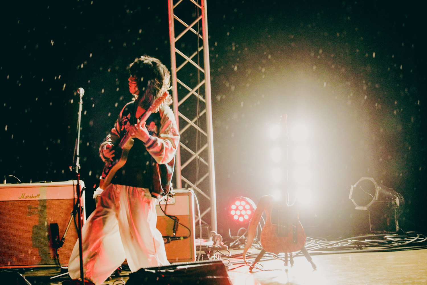 ノイジーでサイケなインスト曲「ばける」から「化けよ」に移行した後半、ステージに焚かれたスモークが雨で湿気を帯び、ぞくぞくする色気を醸し出す。2人が楽器を持つと何が起こるかわからないワクワク感がたまらない。どっぷりドミコワールドに浸っていると、あっという間にラストチューン。最近のイベントやフェスでは定番となっている「ペーパーロールスター」だ。この曲は後半のロングセッションが見もの。