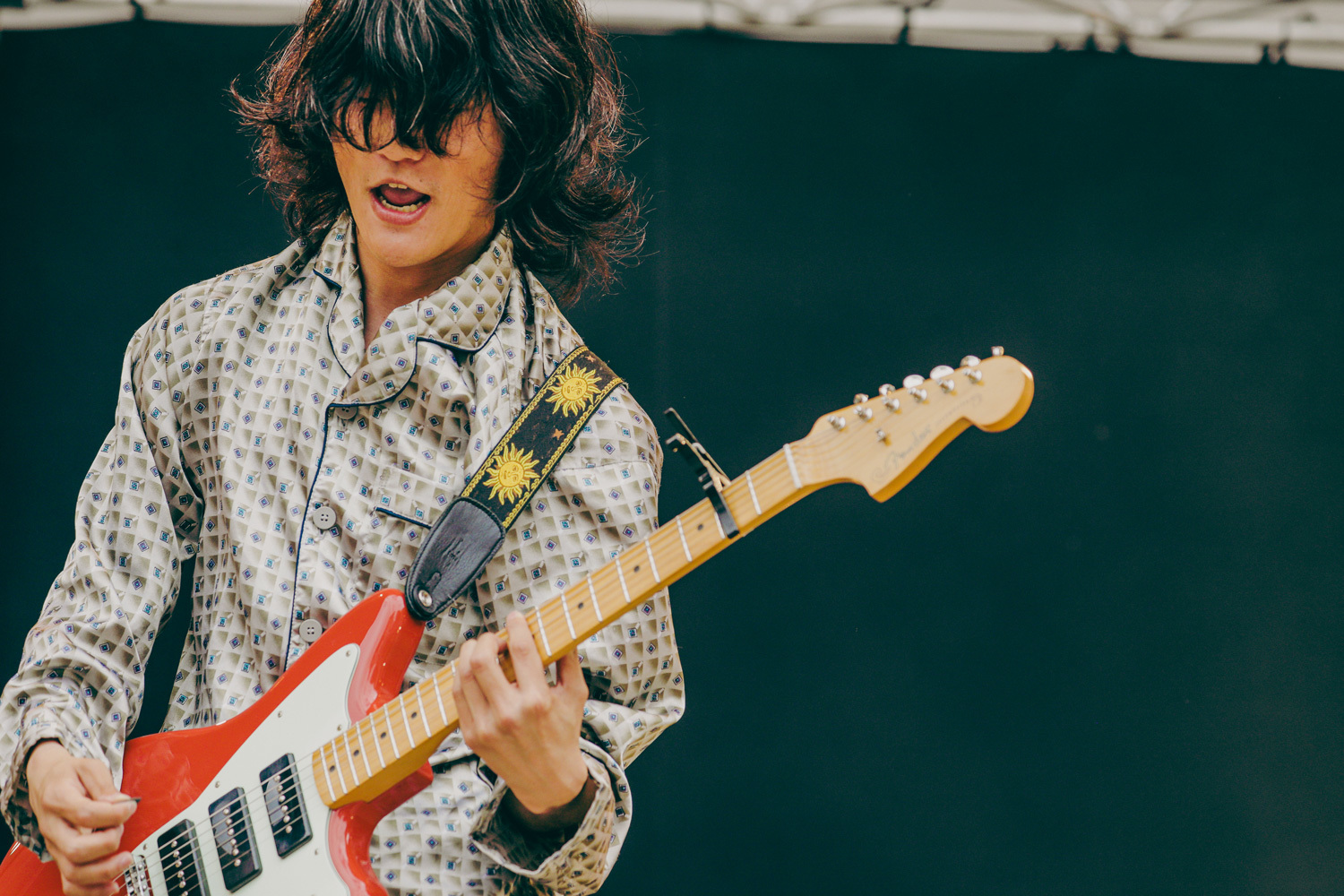 「united pancake」に続いては3月にリリースされた1年7ヶ月ぶりの新曲「なんて日々だっけ?」をドロップ。超絶テクニックが詰め込まれた一筋縄ではいかない構成の楽曲は唯一無二。客席も音に身を任せて狂ったように踊りまくる。高らかに「セーンキュー!」とさかしたが叫び、雨足が強まる中で「まどろまない」を披露。ドミコのライブはMCなしでシームレスに駆け抜ける。ルーパーを多用をした変幻自在な2人のセッションが痺れるほどにカッコ良い。ギターリフとリズムごとに左右でスイッチする照明も楽曲の世界観を引き立てる。さかしたの歌声が高く激しくなるにつれて客席の熱も高まり、野音はダンスフロアに大変化した。