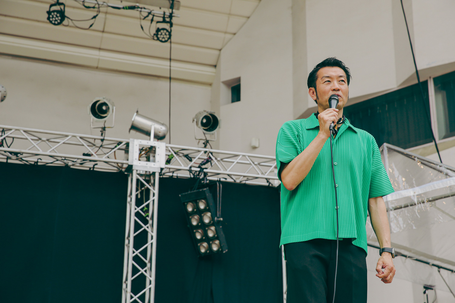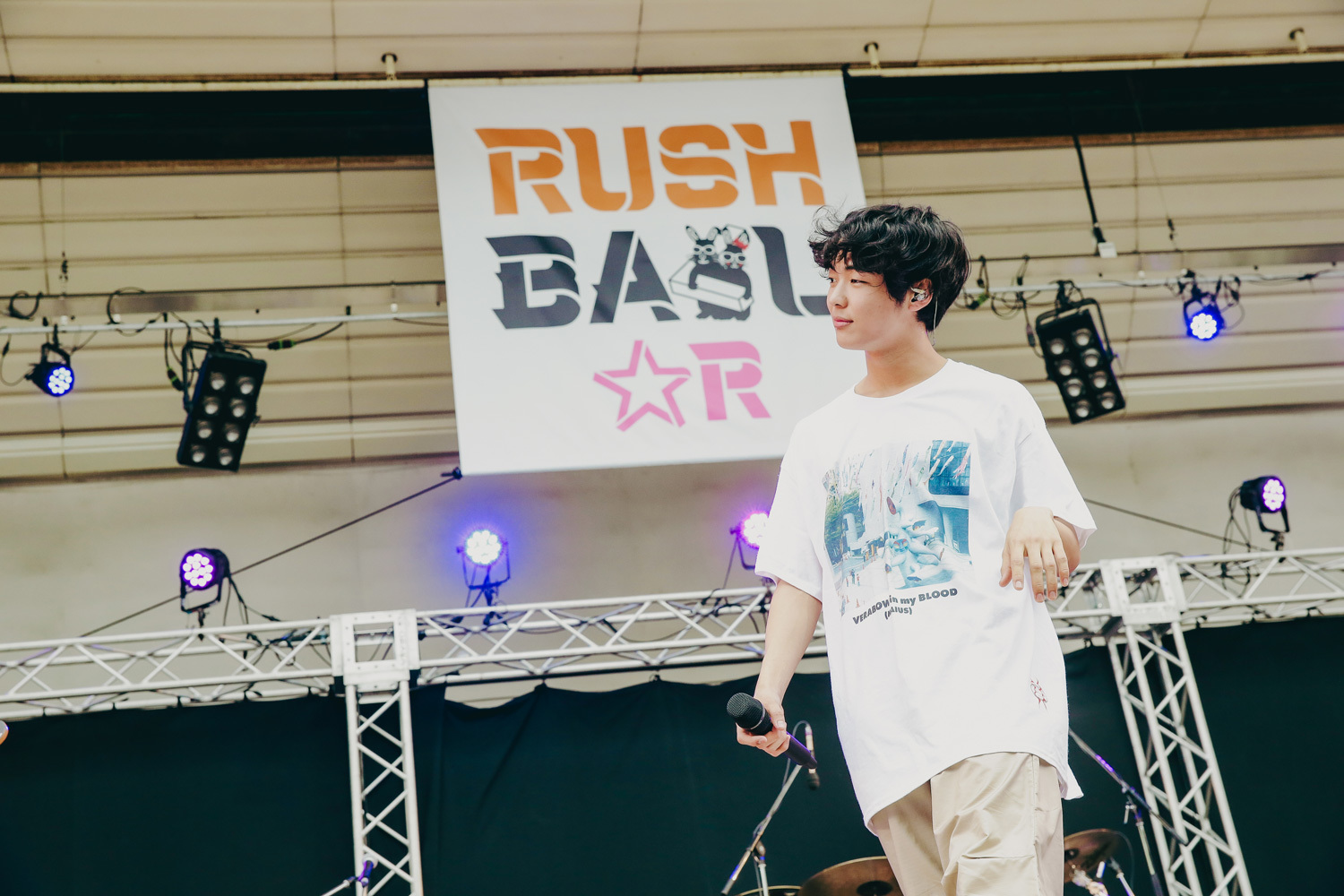 定刻の13:30になり、FM802 DJの大抜卓人がステージに登場。注意事項を述べてから、『RUSH BALL』と『RUSH BALL☆R』のつながりを振り返る。「これまでを思い出すと、[Alexandros]が[Champagne]で出てた時ももちろん見てたし、土砂降りの雨の中でBIGMAMAがトリをつとめた『R』も見てた。2014年はSHISHAMOとgo!go!vanillasがやってましたし、2015年のトリはWANIMAでした。(中略)『RUSH BALL』25周年のラインナップに欠かせないアーティストもみんな、実はここから始まっています。今日もまさしくこれからにおける大事な物語を紡ぐアーティストがたくさん出てくるので、目一杯新しい音楽との出会いも楽しんでください!」と、長年両イベントの歴史を見守ってきた大抜だからこそのコメントで『RUSH BALL』への愛を伝え、トップバッターへバトンをつなぐ。