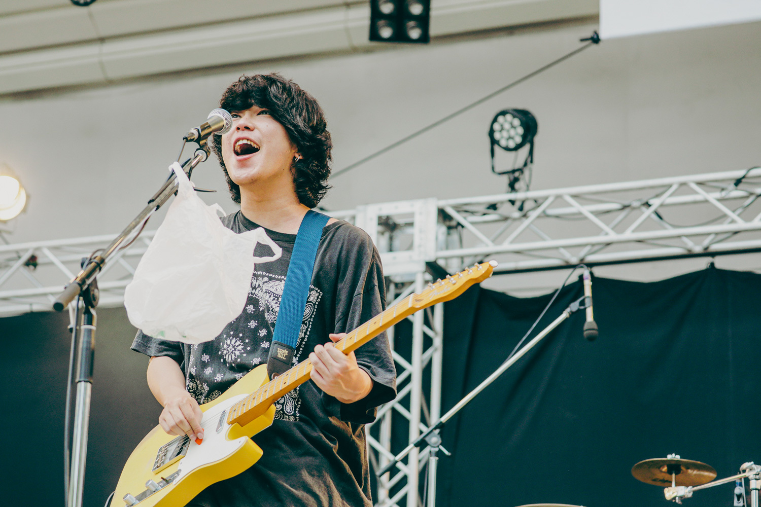 再び晴れ間が差した折り返し地点で登場したのは、埼玉発のペルシカリア。この日は中村達也(Dr)が学業専念のためにライブ活動を一時休止する前の関西での最後のライブ。サウンドチェックからファンを盛り上げ、そのままの勢いで「さよならロングヘアー」を皮切りに、「恋心納品日」「死ぬほどどうでもいい」など心情を吐露する楽曲を荒々しく叩き込んでいく。矢口結生(Vo.Gt)のマイクスタンドにコンビニ袋がかけられていたが、Twitterを見るに二日酔い対策だったそうだ。矢口の命を燃やすようなボーカル、中村と中垣(Ba)のリズム隊、フルギヤ(Gt)のギターソロが炸裂。開始8分で早くも熱狂を作り出し「俺らのこと好きにさせるまで帰さねえからな!」と「ビビって」を投下する。