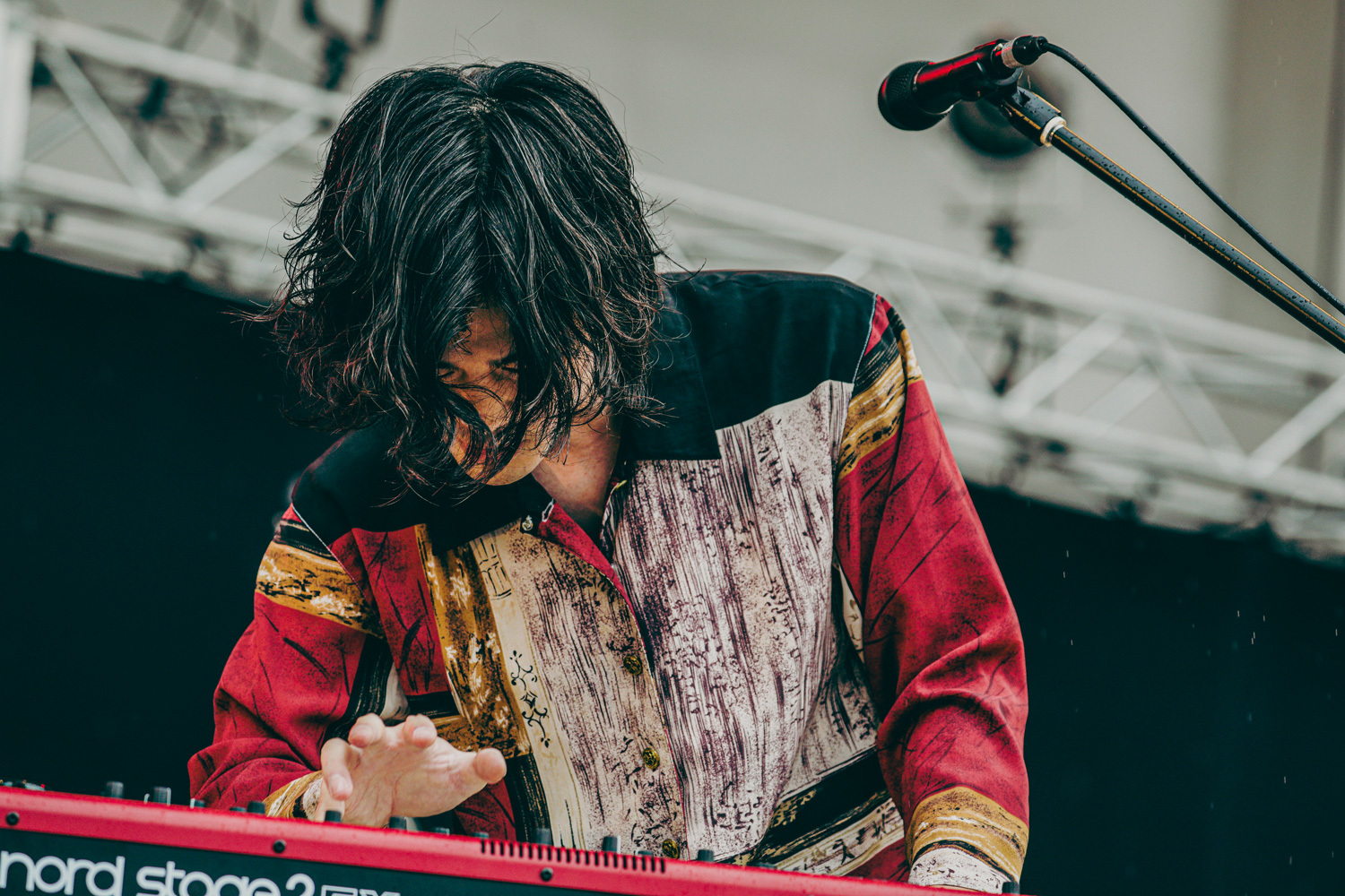 激しくも上品さを感じるパワープレイは往年のロックスターの風格だ。<ウォーオオオオ!>というシンギングから始まった「Wide Bright Eyes」ではYoheyのベースが大活躍。別世界に連れて行かれるように無心で踊らされる。何て渋さだ。Reiは「こんなにキーボードが滑らかにすべったことないわ!(笑)もう足元トゥルトゥル! 皆さんもトゥルトゥルで楽しみましょう!」と雨の激しさを楽しんでいる様子。演奏中とMCのギャップも魅力的だ。